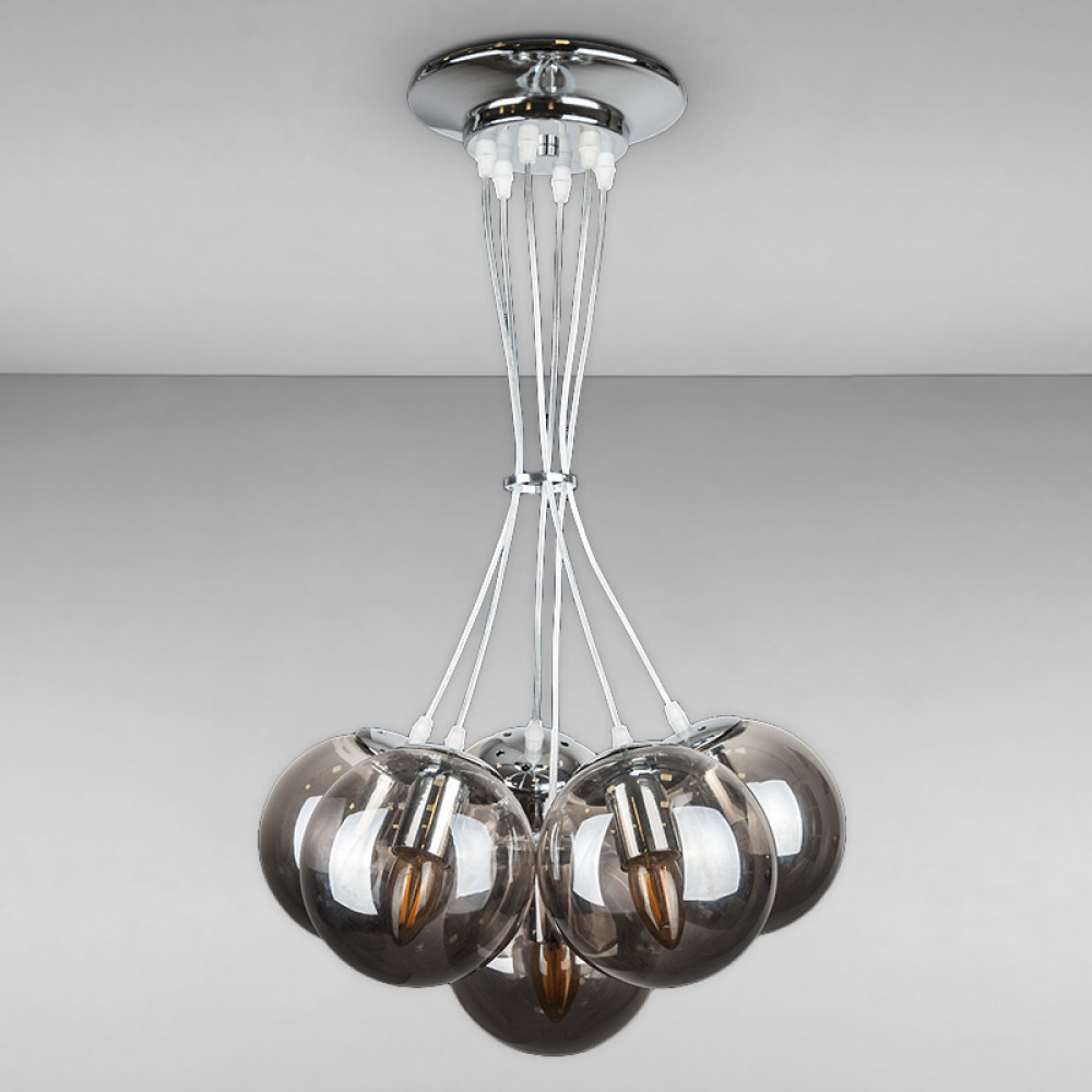 Декоративна підвісна люстра на шість ламп з плафонами у формі сфери.