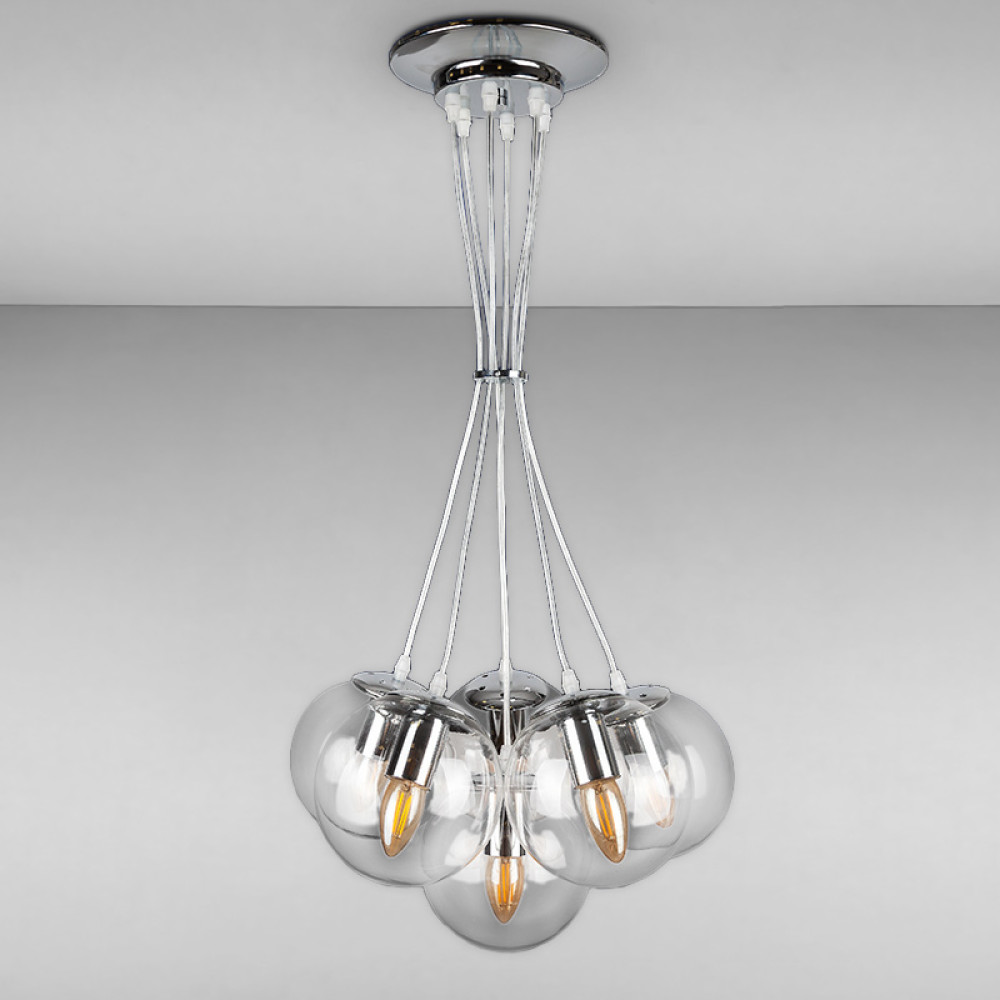 Декоративна підвісна люстра на шість ламп з плафонами у формі сфери.