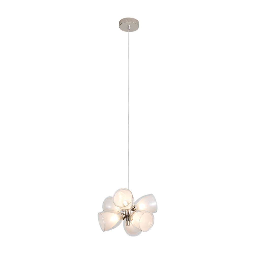 Підвісна декоративна люстра молекули на шість ламп G9 зі скляними плафонами конічної форми. Найкраще ця люстра підійде для освітлення 16 м² приміщення при використанні лампочок 6 Вт (LED), буде актуальна для приміщень з високими стелями. Висота підвісу регулюється, що дозволяє адаптувати підвіс під різні простори і потреби.