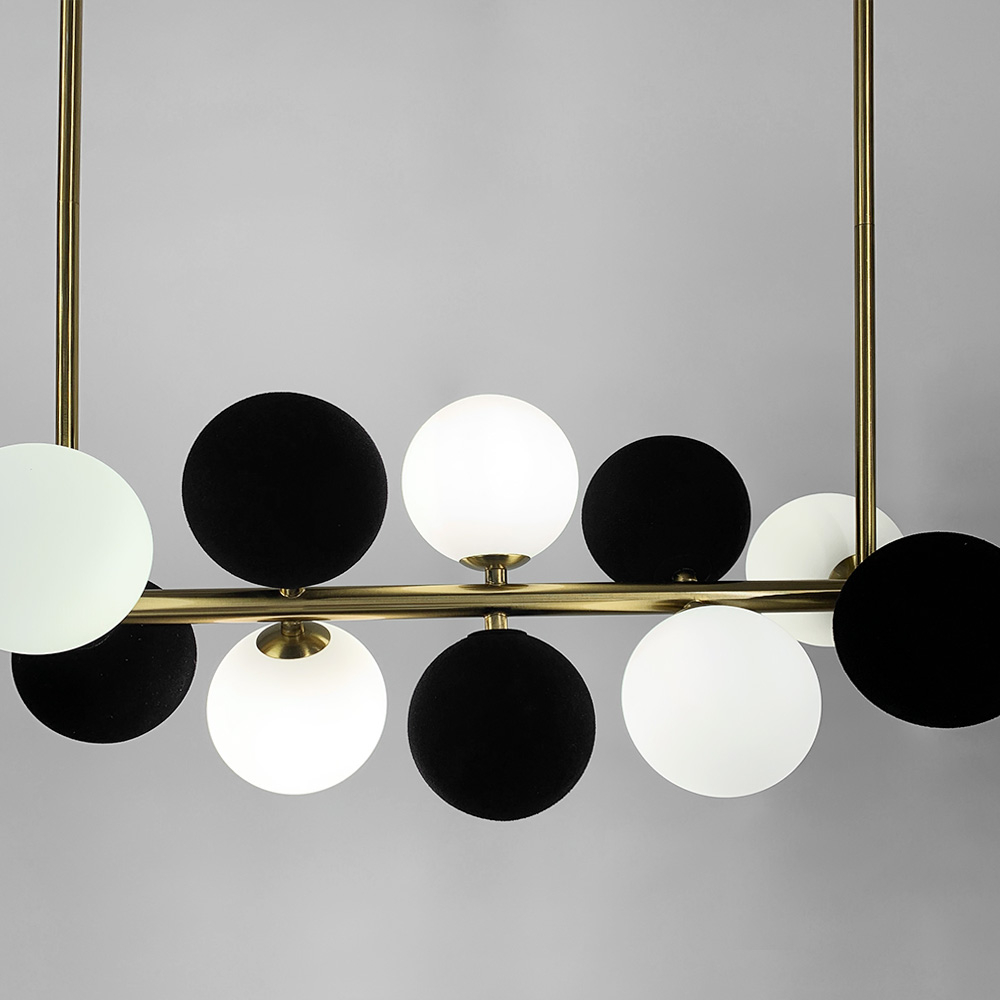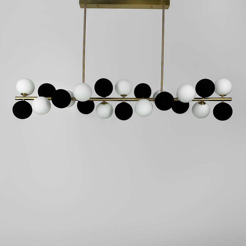 Подовжена латунна люстра з чорно-білими плафонами у 2-х розмірах: на 18 плафонів – довжина 100 см – 9 ламп | 9 декоративних чорних кульок - стельова основа 50х6х2,5 см - монтажна планка 16,5 см на 22 плафони - довжина 100 см - 11 ламп | 11 декоративних чорних кульок - основа стеля 50х5х3 см - монтажна планка 32 см.