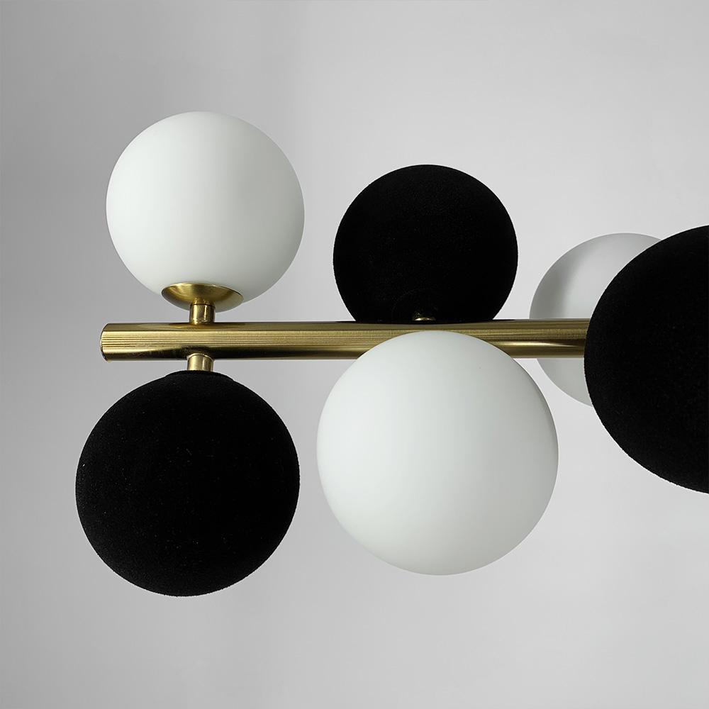 Сучасна модель підвісної люстри у скандинавському стилі виконана у латунному металевому корпусі з білими скляними плафонами (діаметр 10 см) та декоративними чорними велюровими плафонами-кульками.