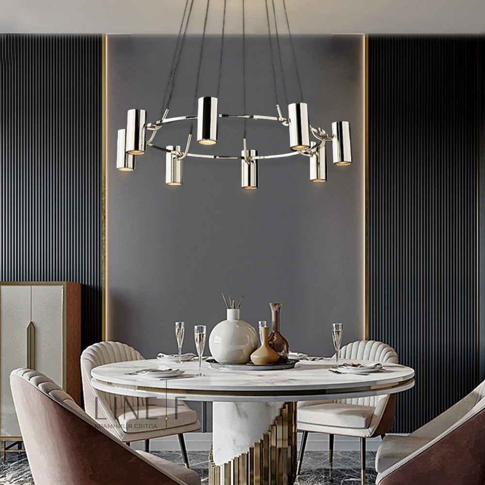 Дизайнерська люстра LNF-17439/8 CH – це підвісна кільцева люстра у металевому корпусі з розташованими по колу спотами.