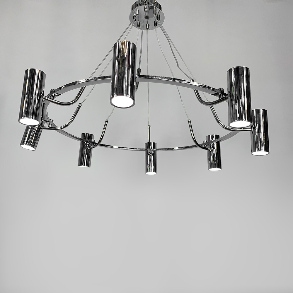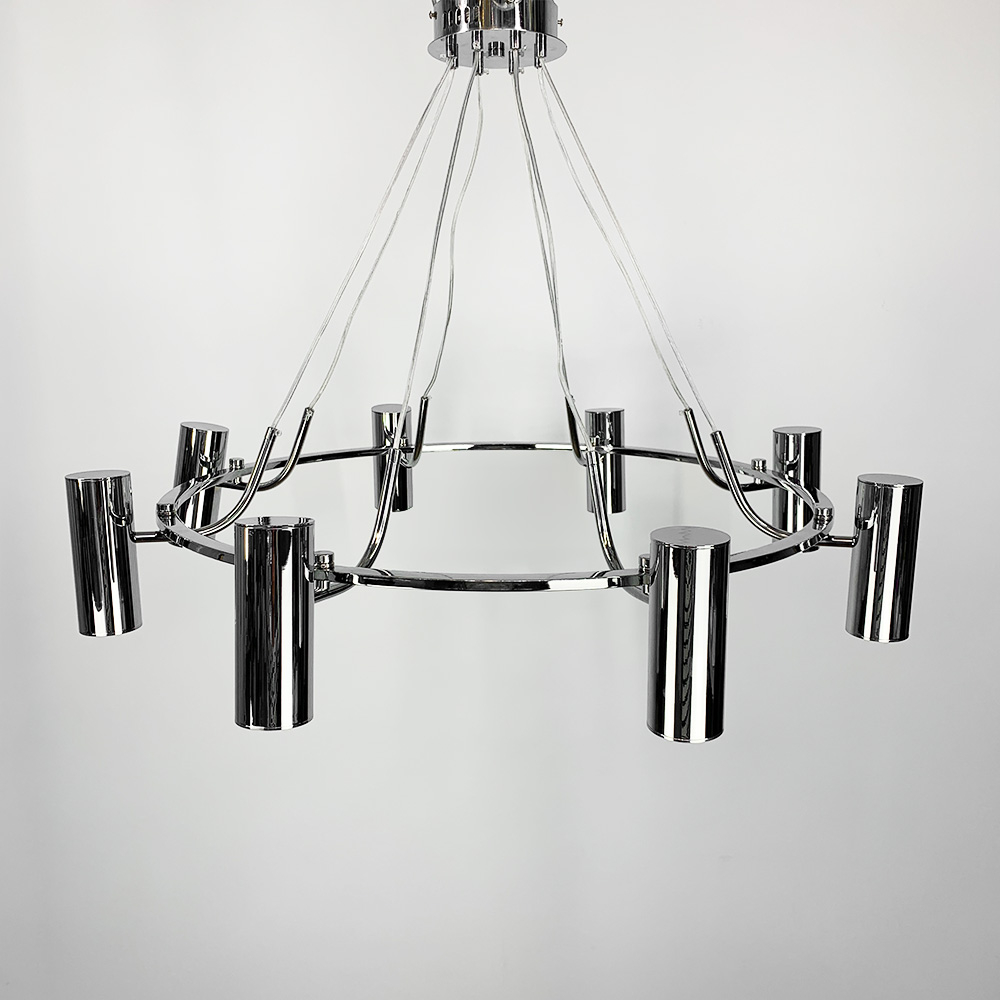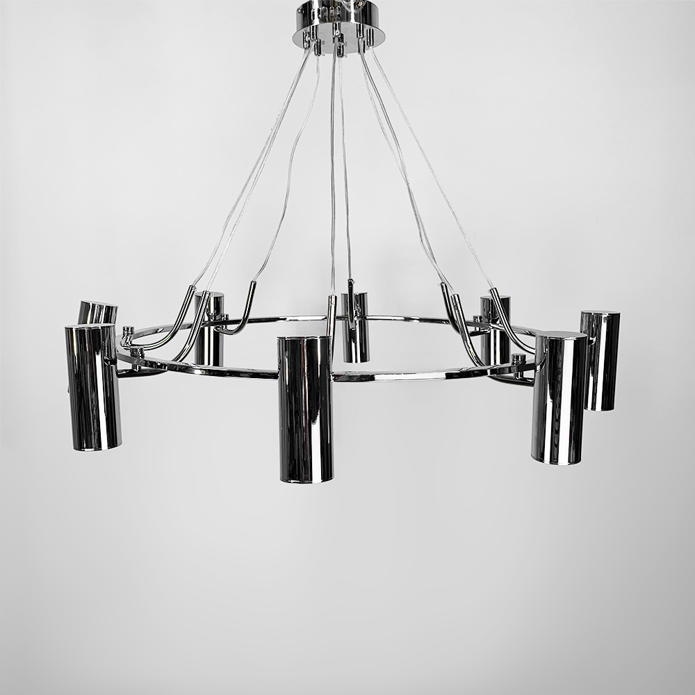 Стильна люстра на вісім ламп з плафонами циліндричної форми.
