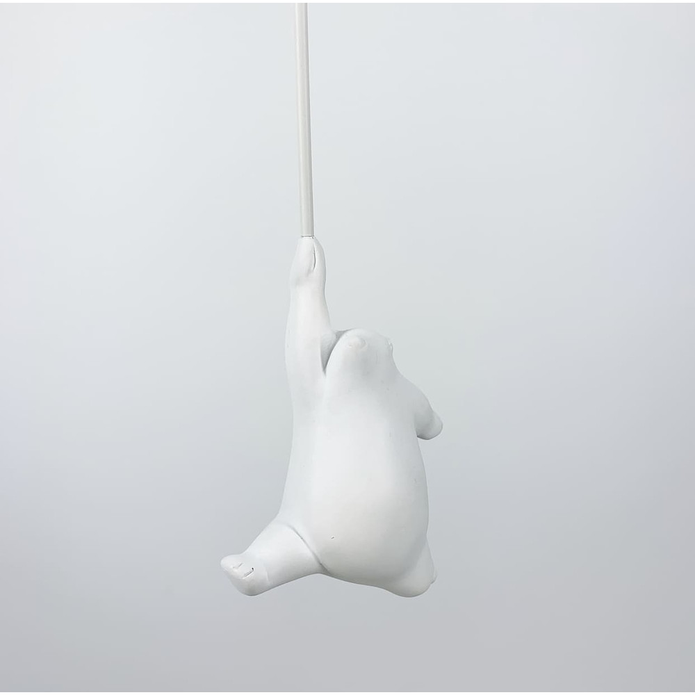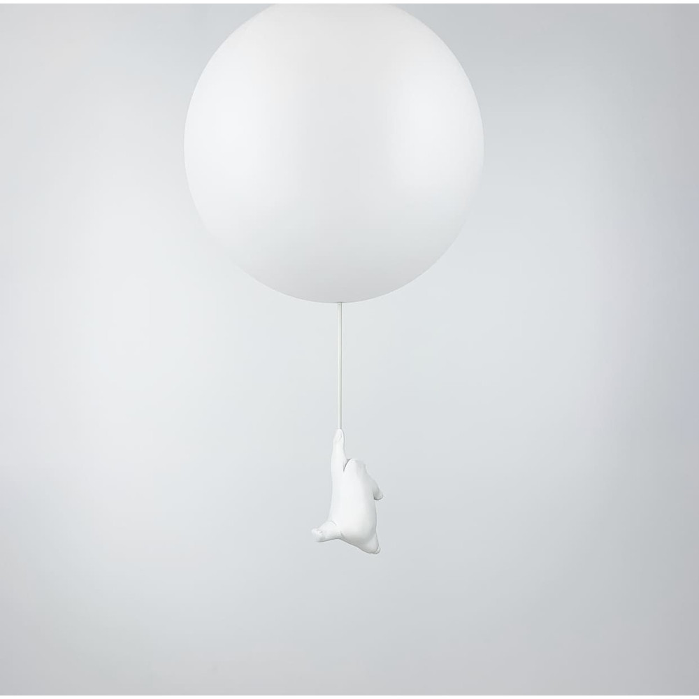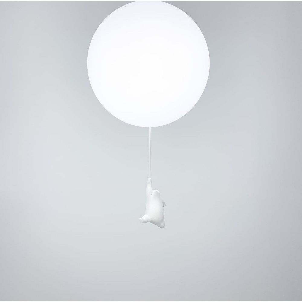 Дитяча люстра на одну лампу з круглим плафоном. Плафон люстри нагадує повітряну кульку з якої звисає декоративна фігурка білого ведмедя.