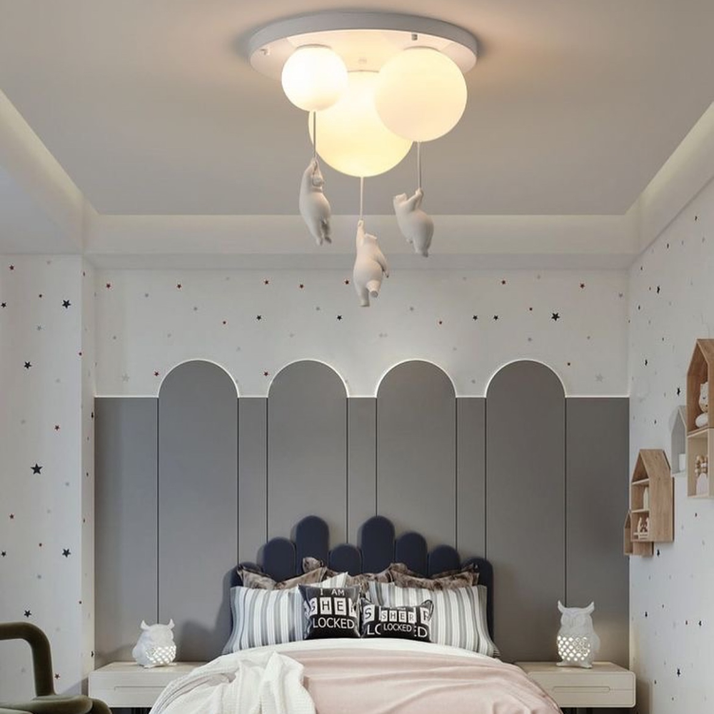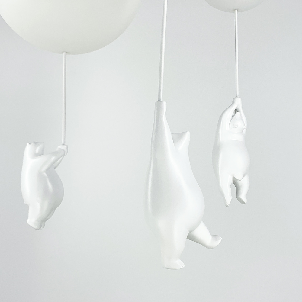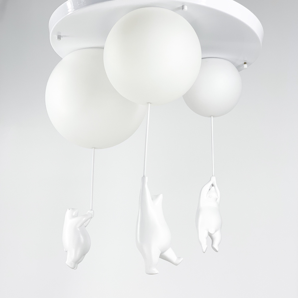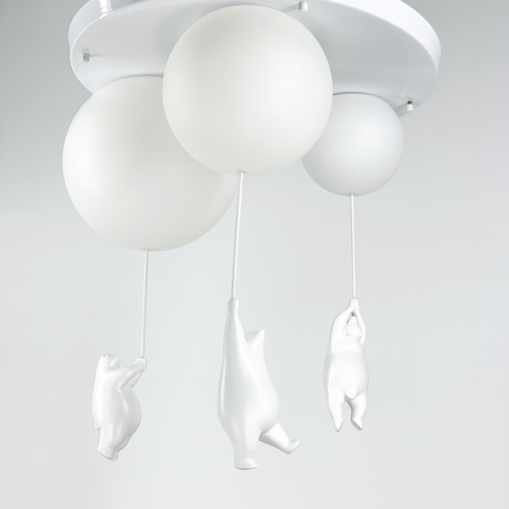 Дитяча люстра з ведмедиками на три лампи серії Bear Balloons з круглими плафонами. Плафон люстри нагадує повітряну кульку, з якої звисає декоративна фігурка білого ведмедя. Матеріал ведмедиків – гіпс, матеріал плафонів – органічний пластик.