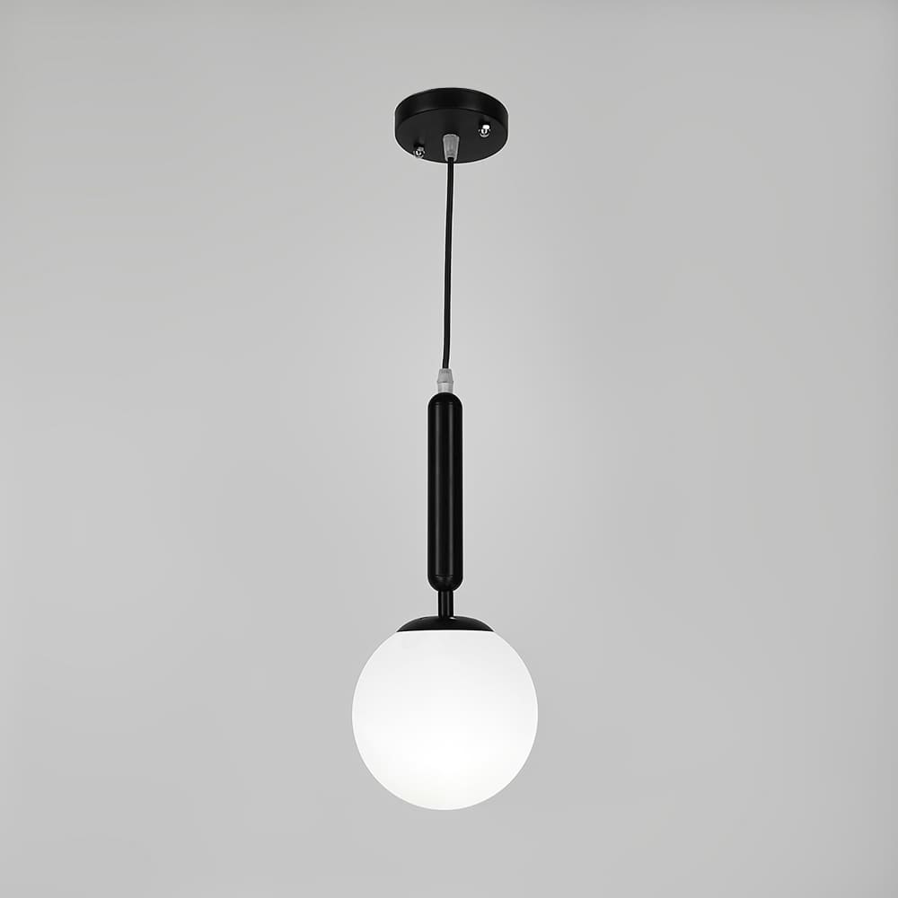 Стильна підвісна люстра на одну лампу зі скляним плафоном-кулькою та декоративним металевим овалом над плафоном.
