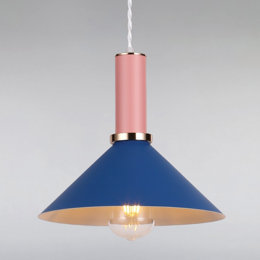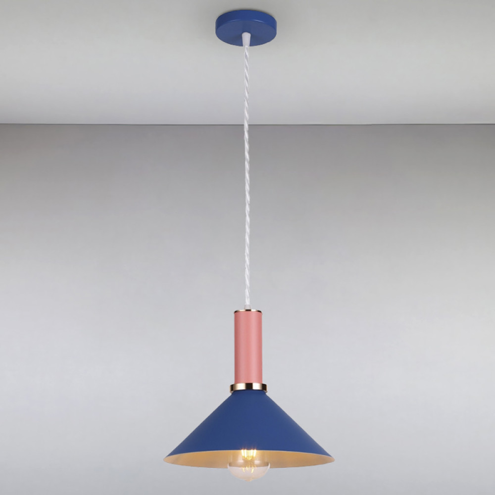 Люстра на одну лампу в стилі лофт, двоколірна з плафоном синього кольору з рожевим елементом.