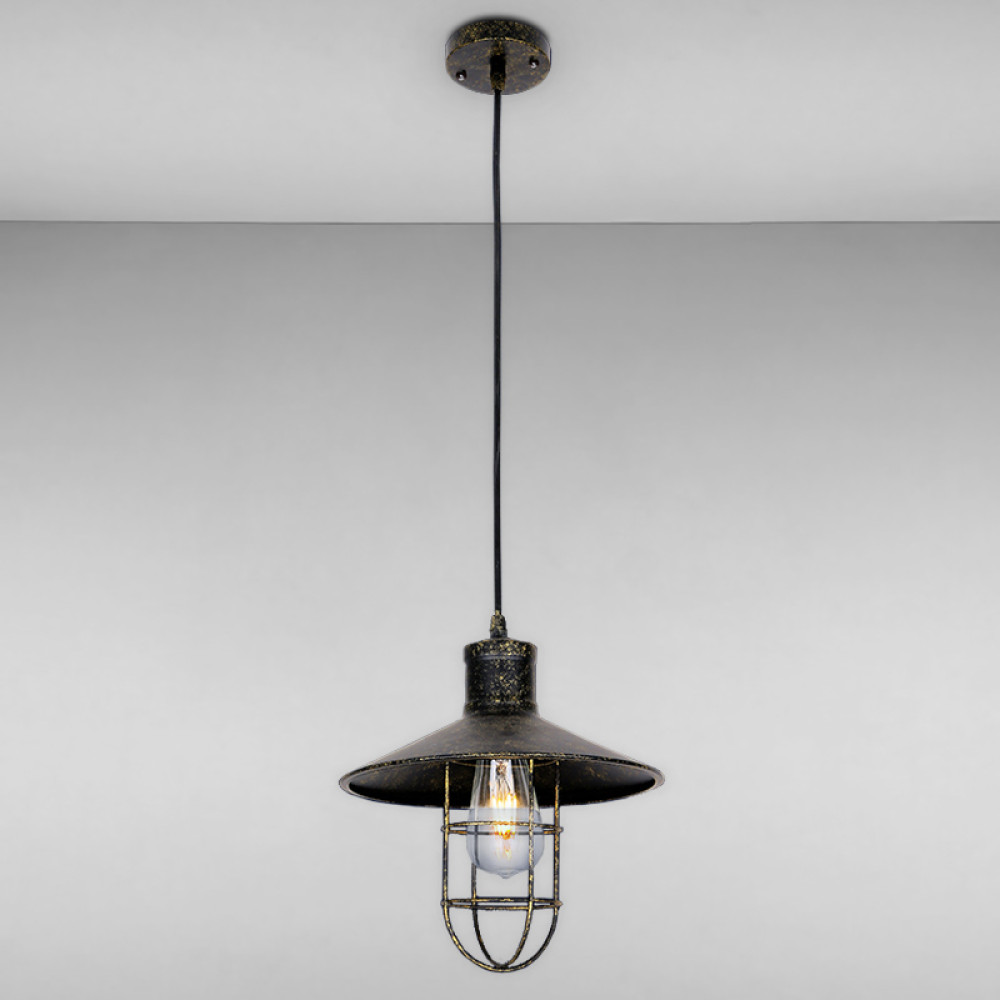 Люстра підвісна на одну лампу з плафоном у вигляді тарілки з решіткою.