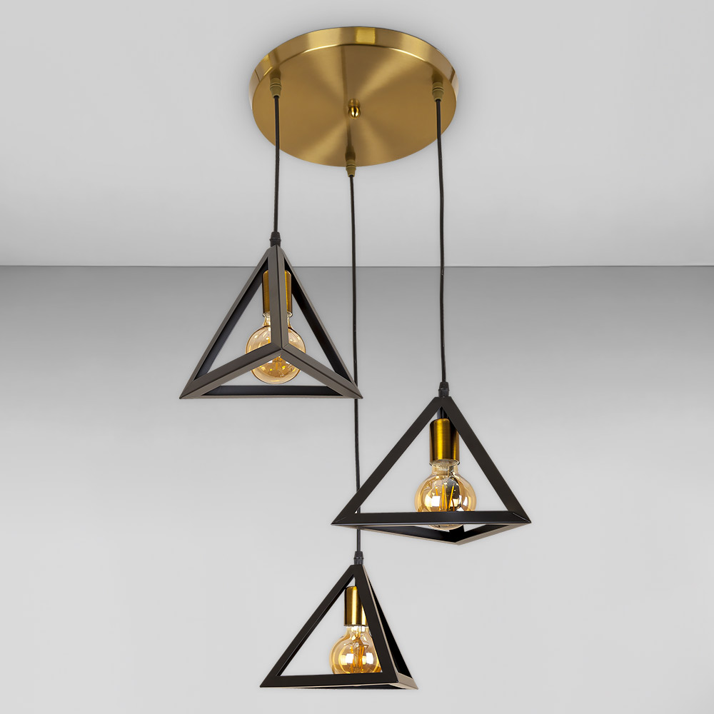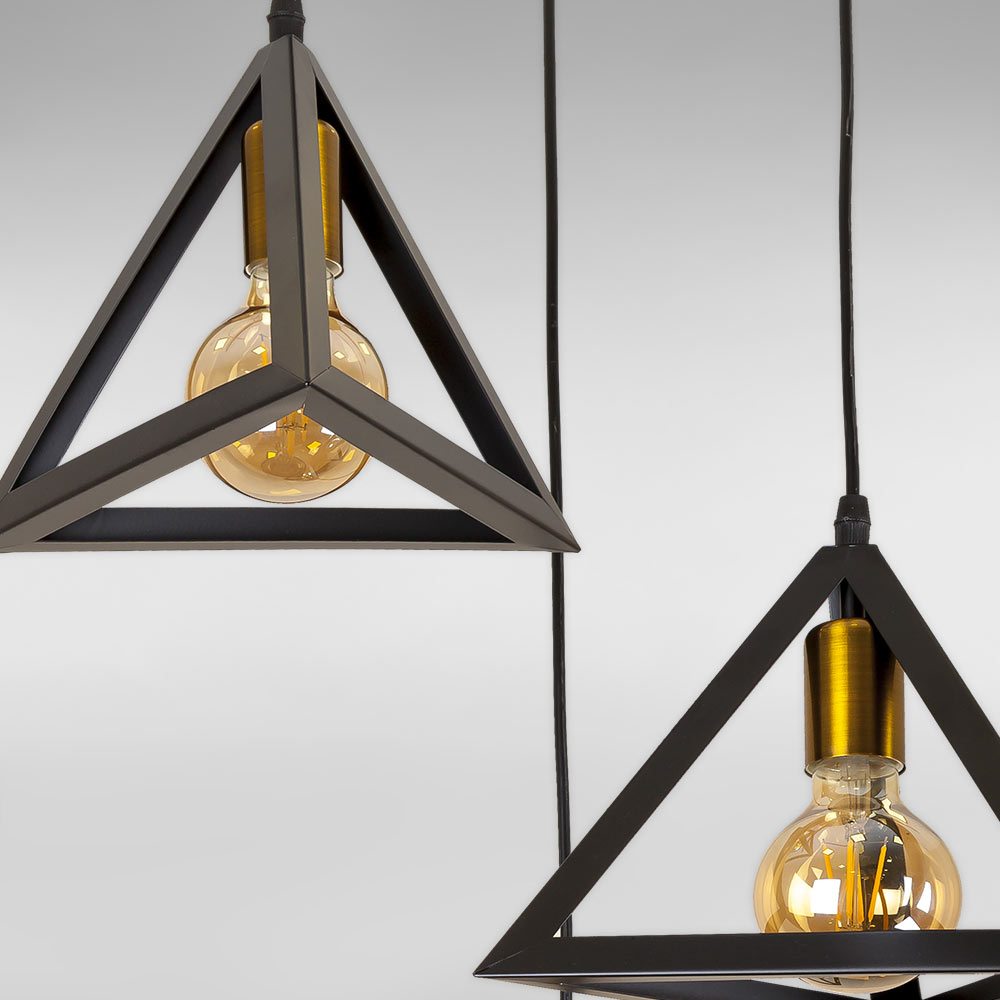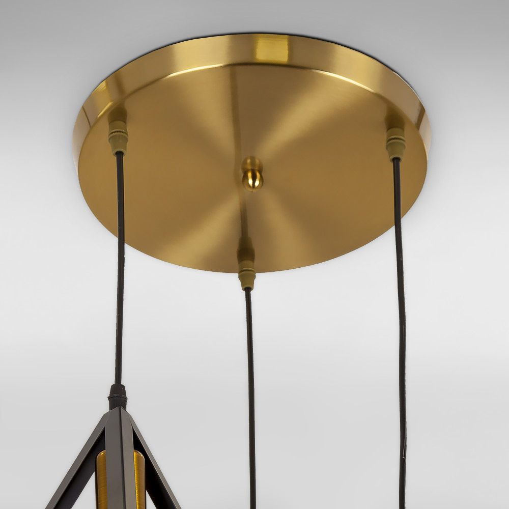 Сучасна підвісна люстра в стилі Лофт на три лампи з металевими плафонами у вигляді ребер піраміди.