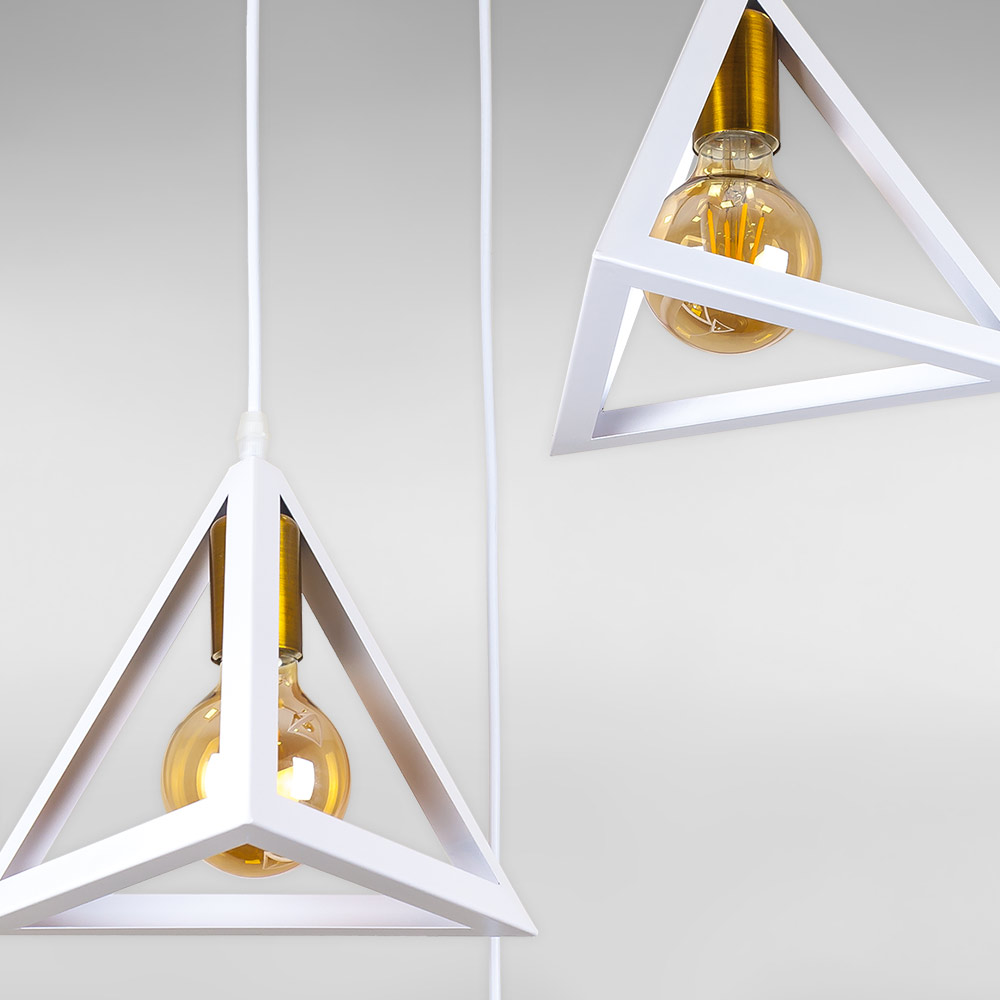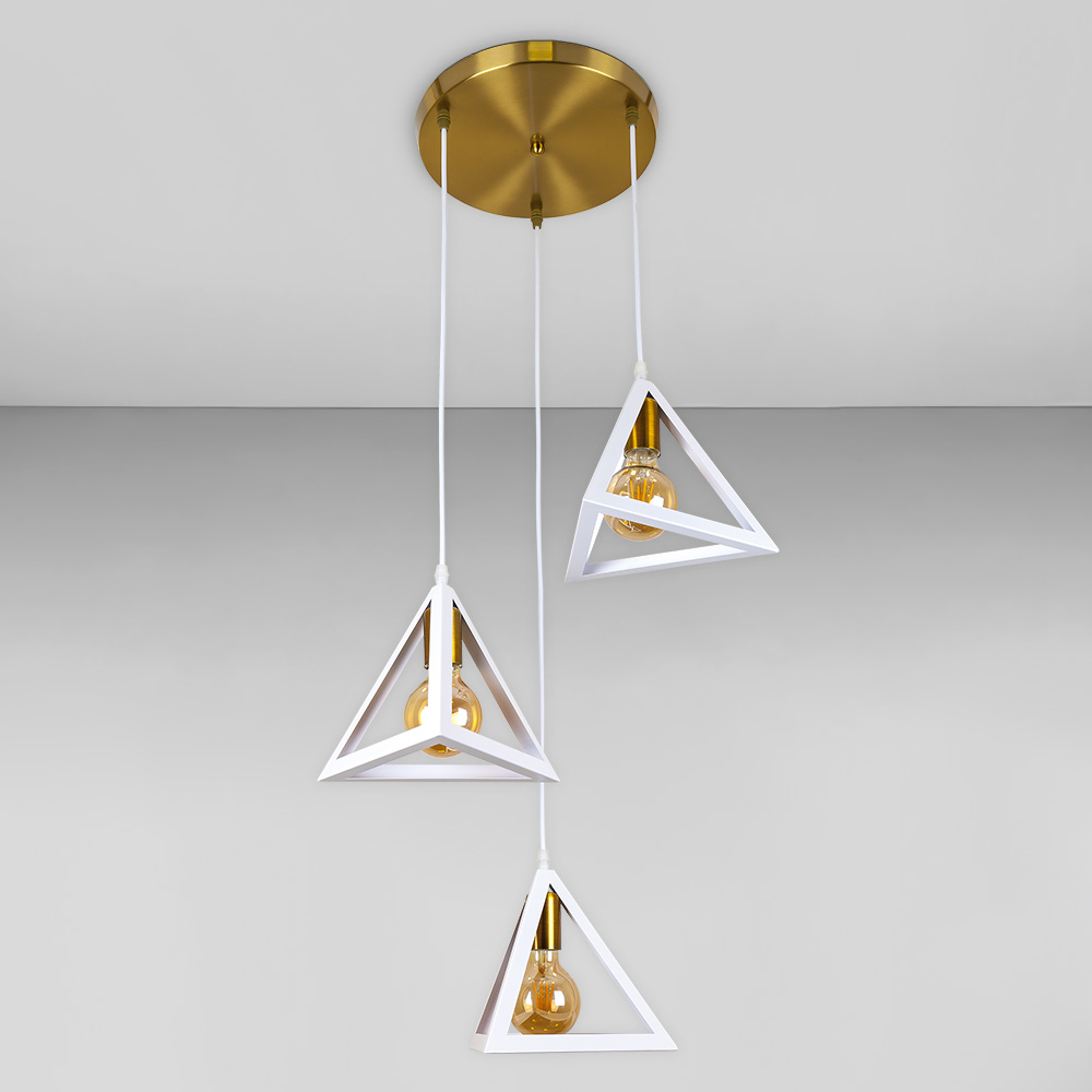 Сучасна підвісна люстра в стилі Лофт на три лампи з металевими плафонами у вигляді ребер піраміди.