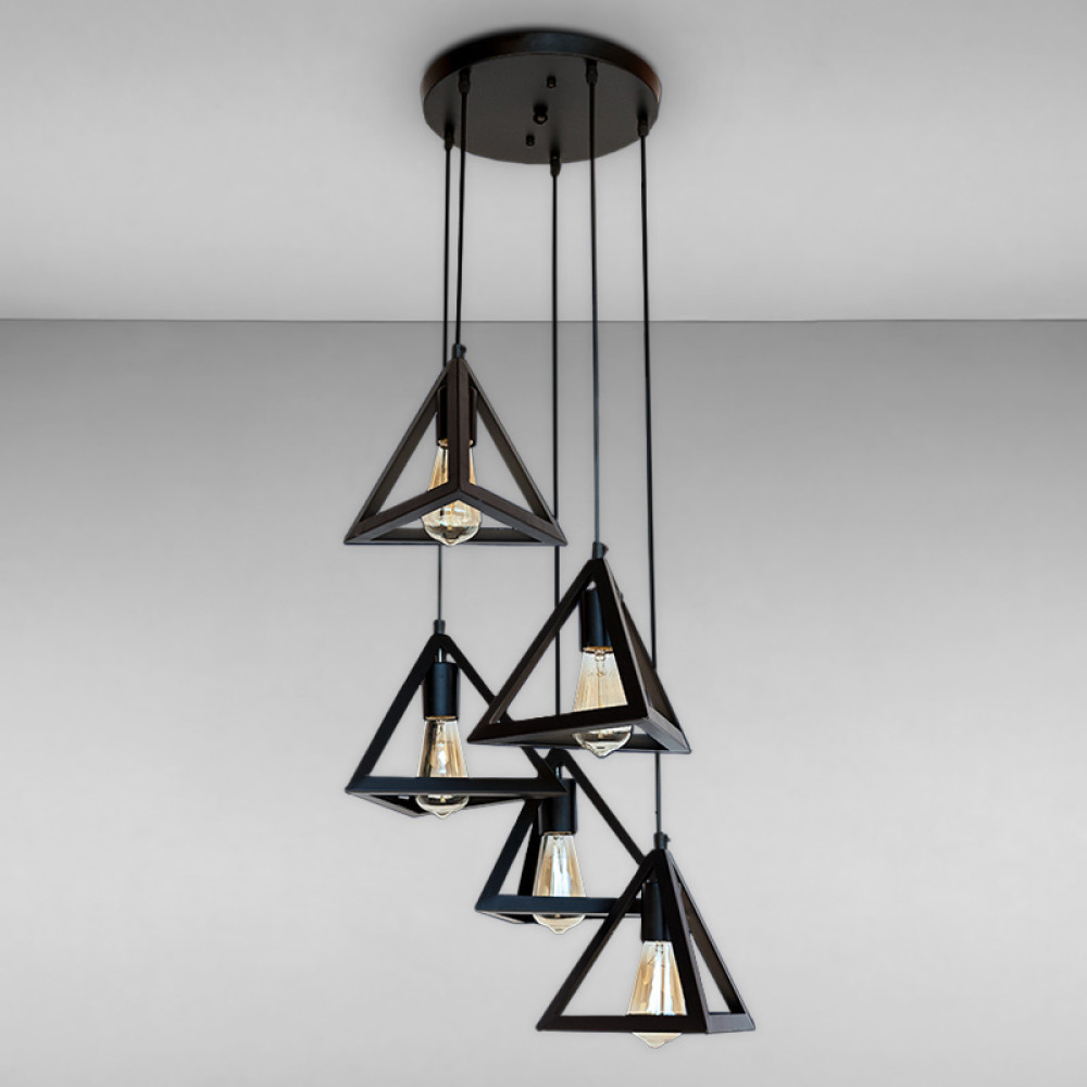 Підвісна люстра на п'ять ламп у стилі лофт із плафонами у вигляді піраміди.