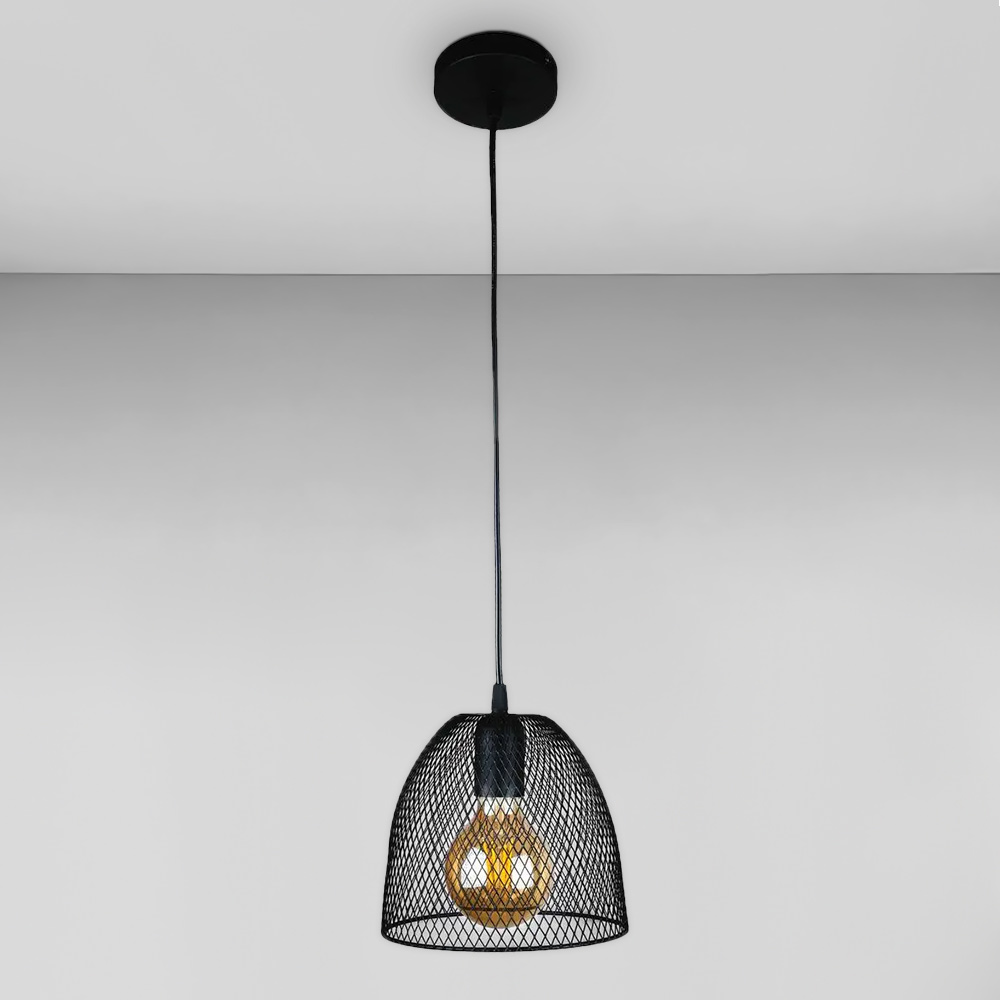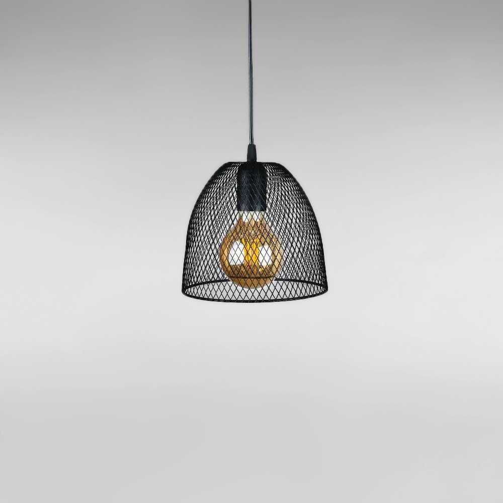 Сучасна підвісна люстра в стилі лофт на одну лампу з плафоном у вигляді металевої сітки форми купола.