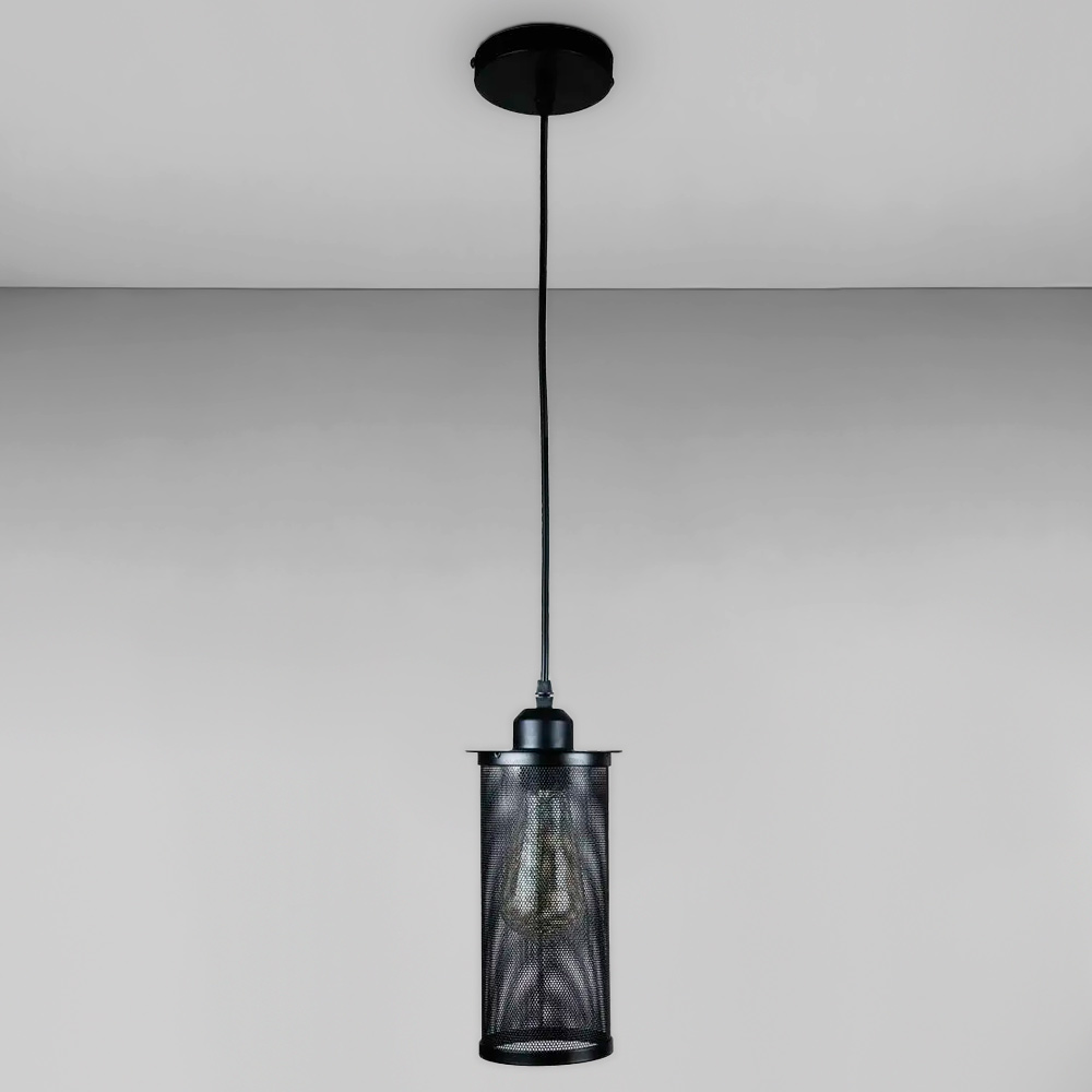 Сучасна підвісна люстра в стилі лофт на одну лампу з плафоном у вигляді металевої сітки форми циліндра.