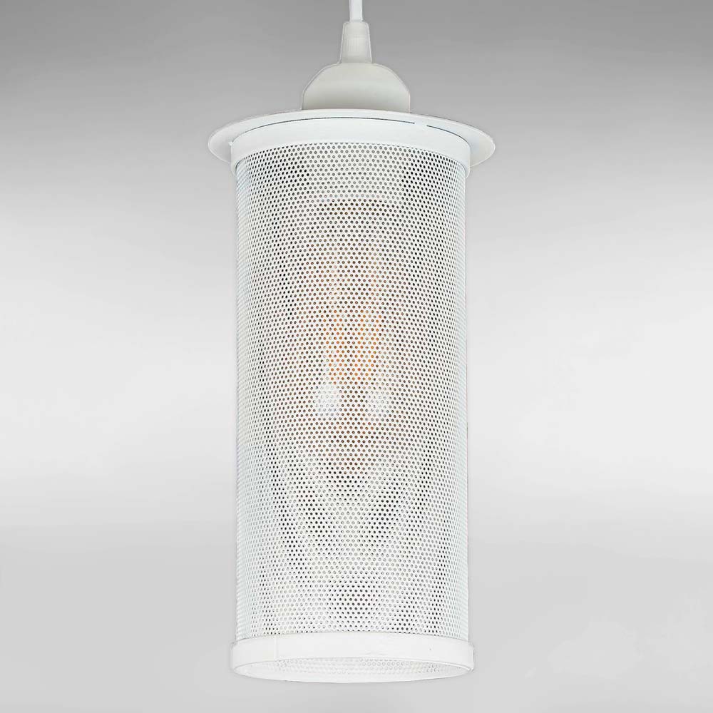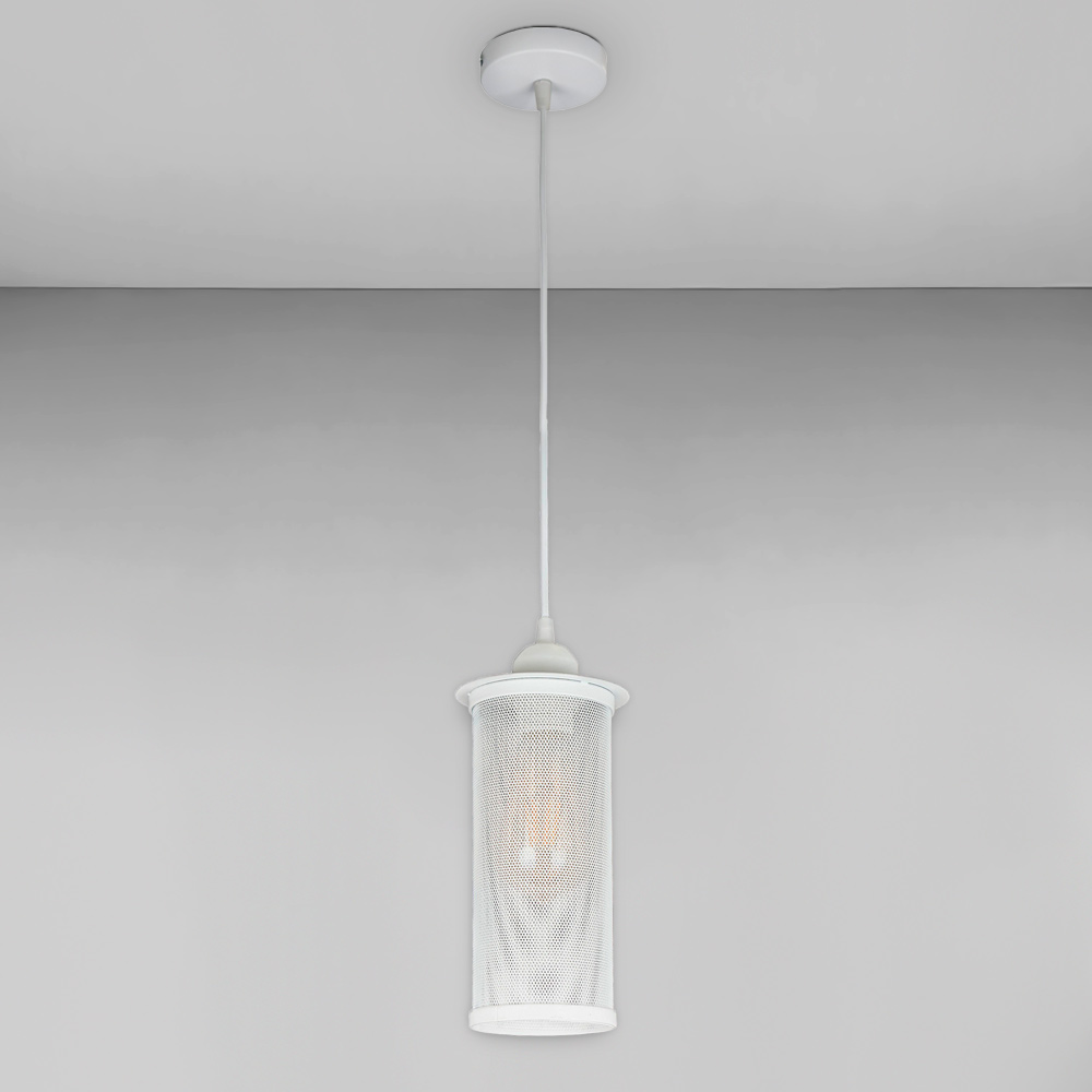 Сучасна підвісна люстра в стилі лофт на одну лампу з плафоном у вигляді металевої сітки форми циліндра.