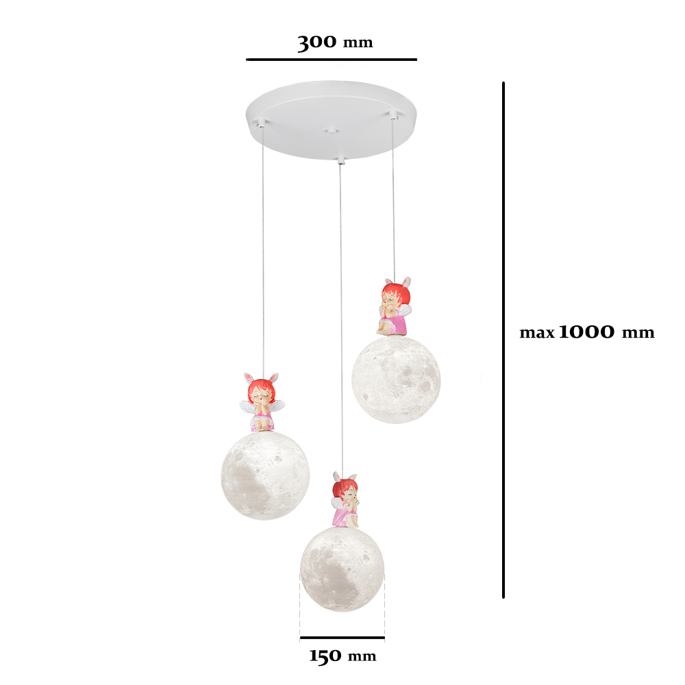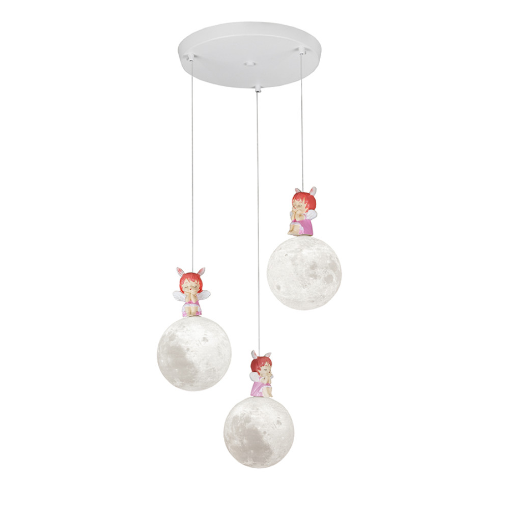Підвісна люстра (світильник) із трьома білими 3D плафонами, що мають незвичайний рельєф поверхні, що цікаво проявляється при включеному джерелі світла, та створює ефект місячної поверхні. На самому плафоні розташована гіпсова фігурка дівчинки. Корпус світильника виготовлений з білого металу.