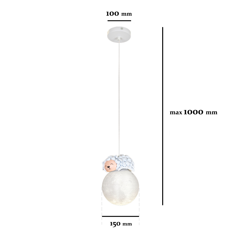 Підвісна люстра (світильник) з одним білим 3D плафоном, який має незвичайний рельєф поверхні, що цікаво проявляється при включеному джерелі світла, і створює ефект місячної поверхні. На самому плафоні розташована гіпсова фігурка овечки. Корпус світильника виготовлений із білого металу.