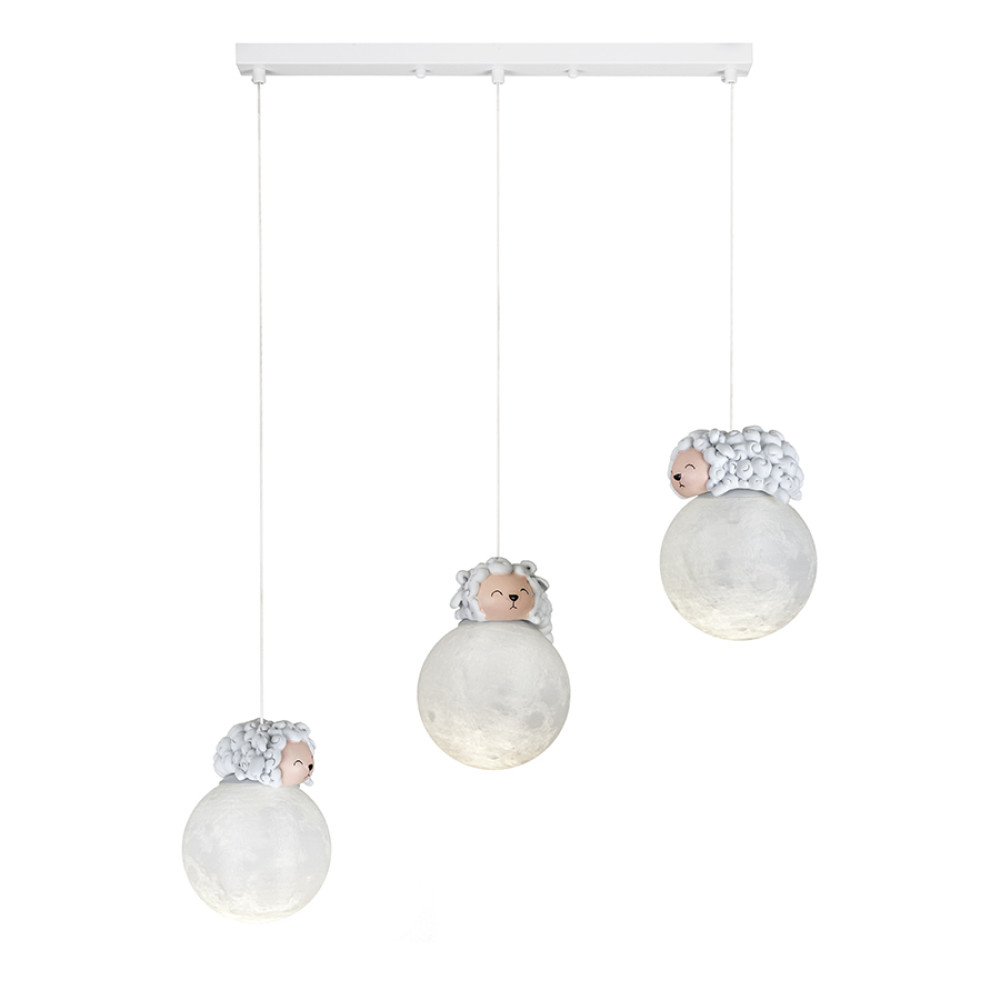 Підвісна люстра (світильник) із трьома білими 3D плафонами, що мають незвичайний рельєф поверхні, що цікаво проявляється при включеному джерелі світла, та створює ефект місячної поверхні. На самому плафоні розташована гіпсова фігурка овечки. Корпус світильника виготовлений з білого металу.