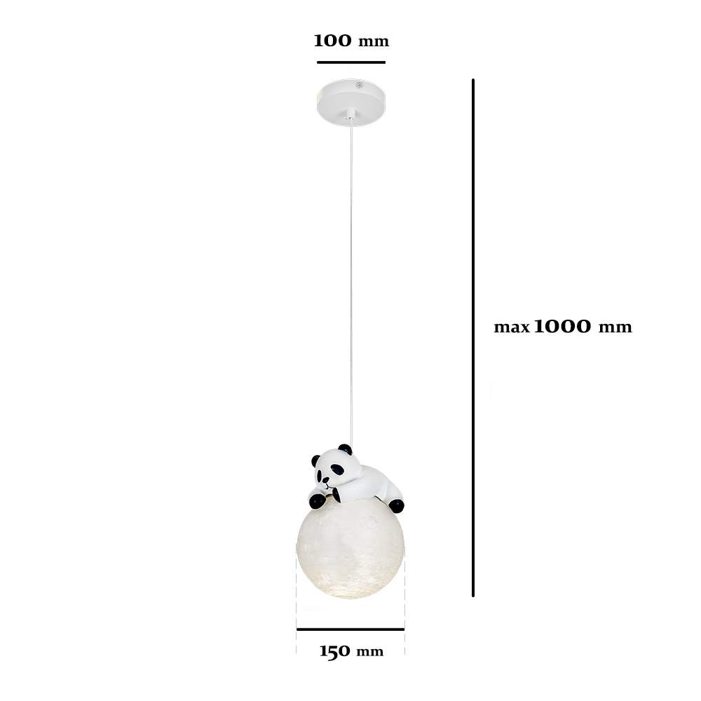 Підвісна люстра (світильник) з одним білим 3D плафоном, який має незвичайний рельєф поверхні, що цікаво проявляється при включеному джерелі світла, і створює ефект місячної поверхні. На самому плафоні розташована гіпсова фігурка панди. Корпус світильника виготовлений із білого металу.