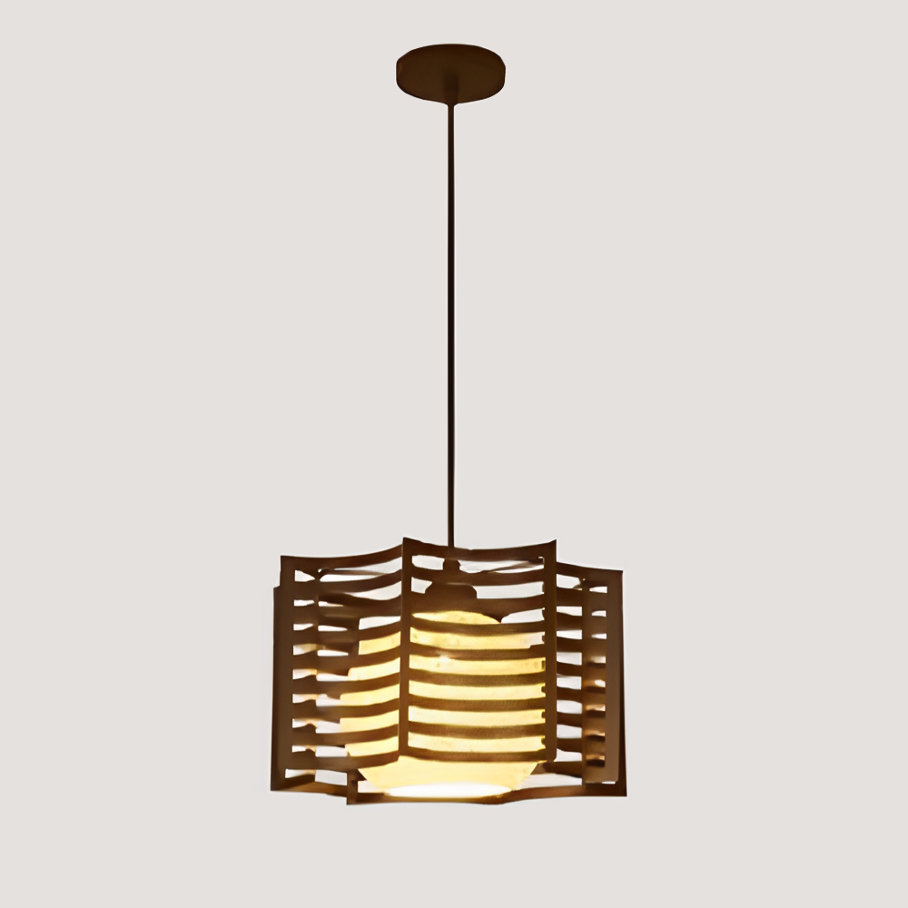 Підвісна декоративна люстра на одну лампу з плафоном у вигляді кулі всередині металевого каркасу.