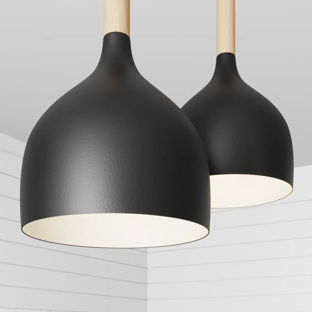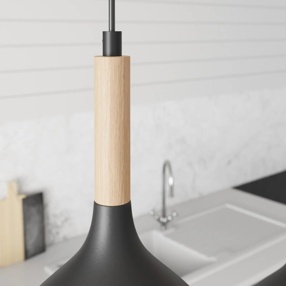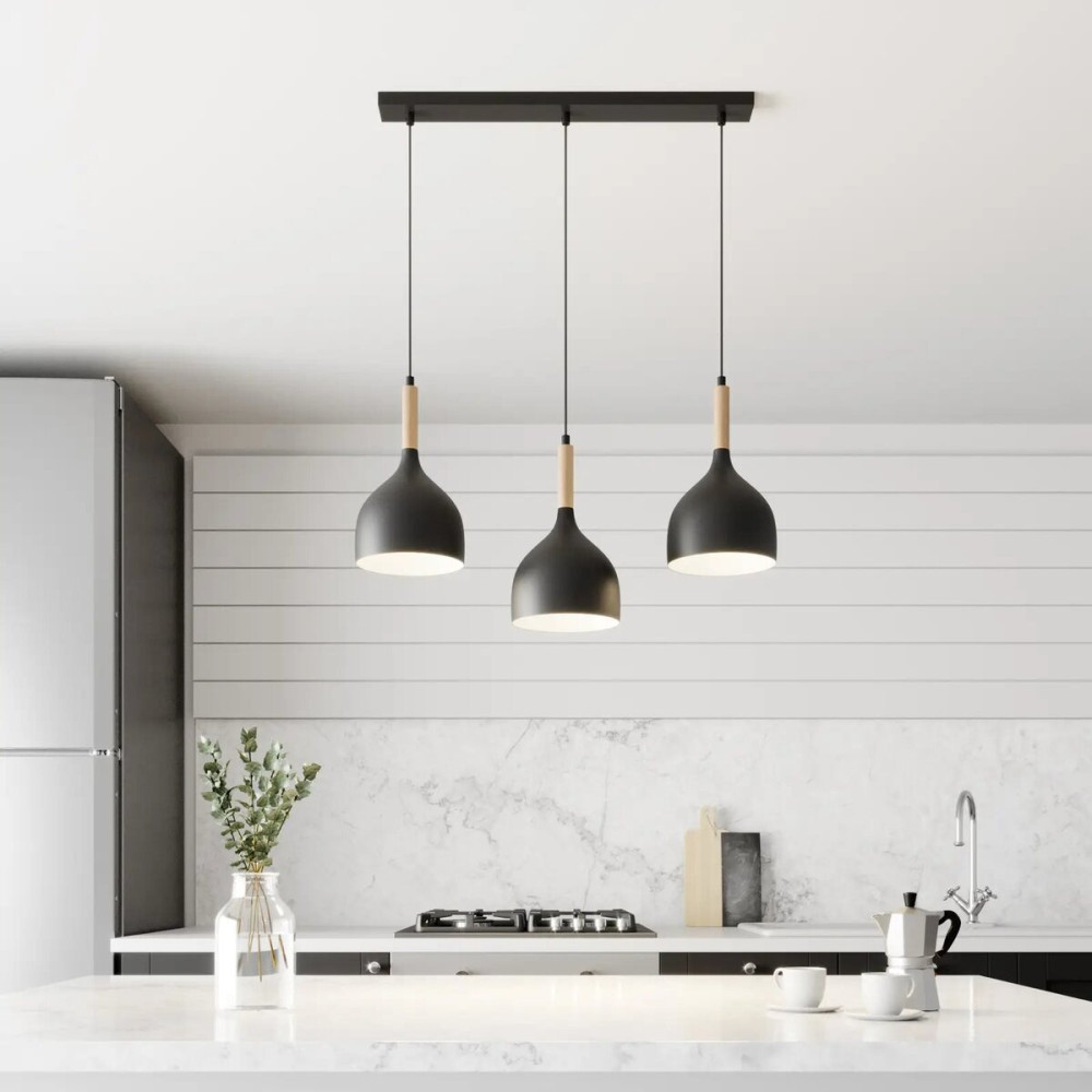 Ця підвісна люстра має довжину 675 мм, ширину 170 мм і висоту 800 мм. Каркас цієї вишуканої люстри виготовлений із металу чорного кольору, що надає їй сучасного та стильного вигляду. Близько трьох плафонів розташований елемент дерева, що надає особливого шарму та природності дизайну.