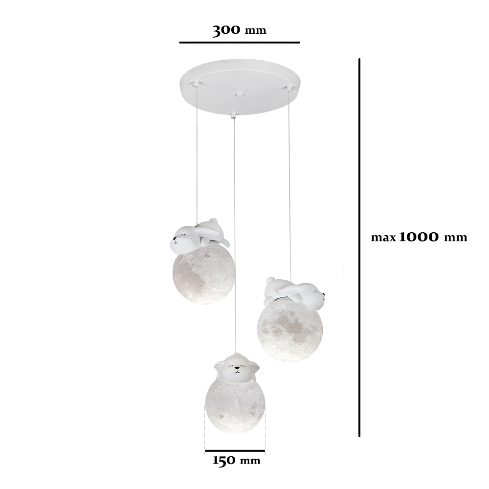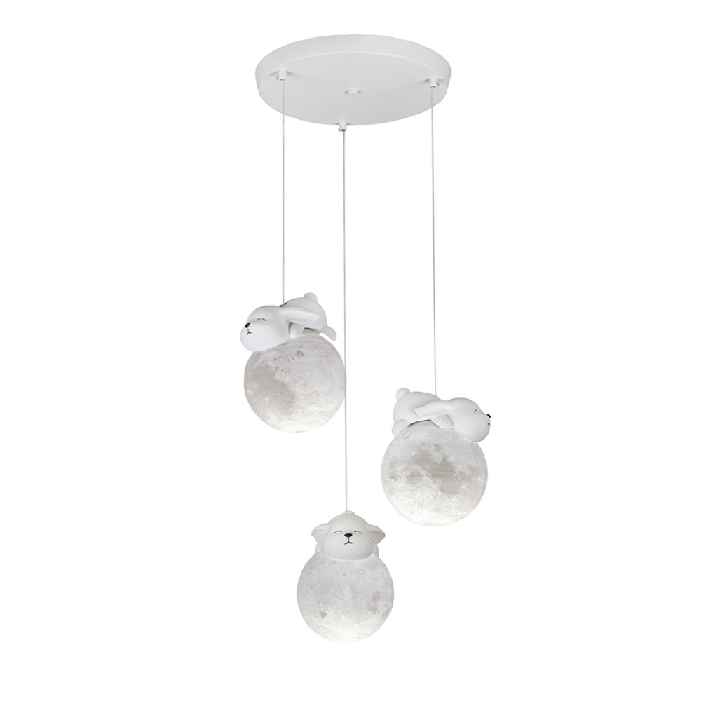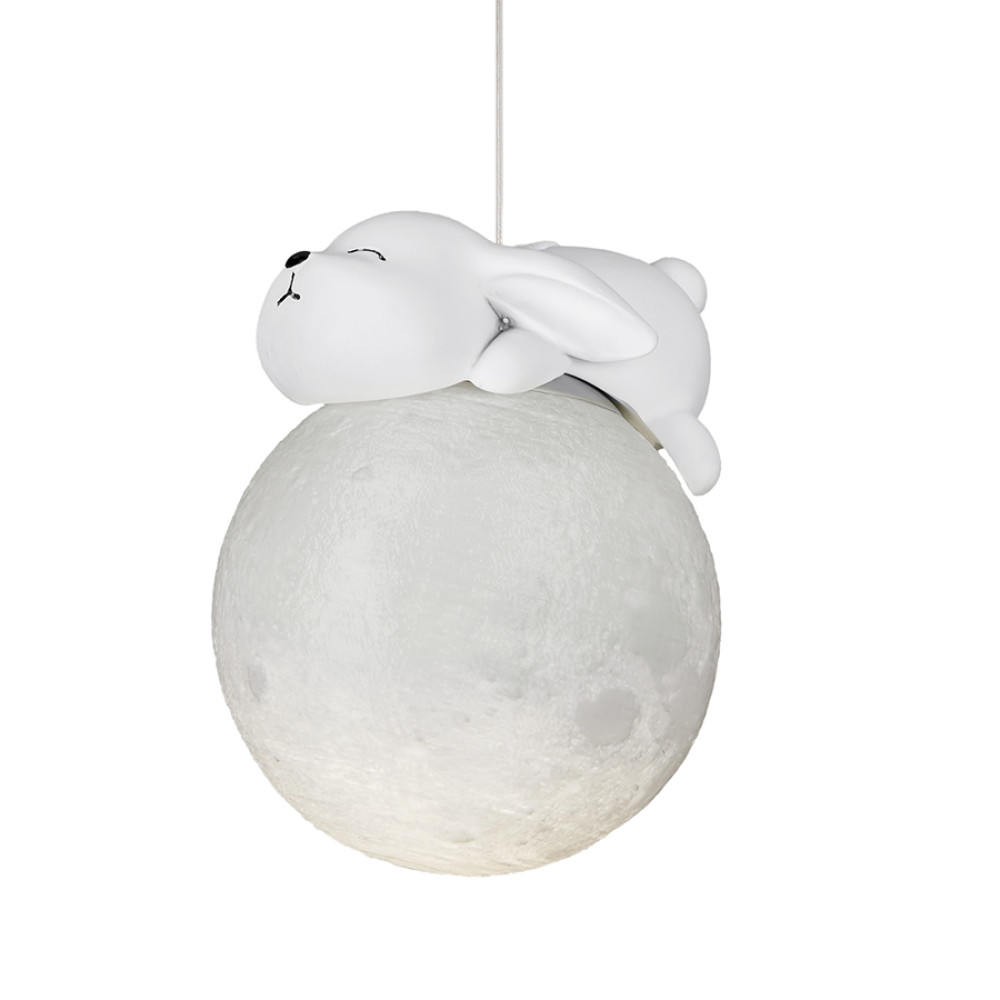 Підвісна люстра (світильник) із трьома білими 3D плафонами, що мають незвичайний рельєф поверхні, що цікаво проявляється при включеному джерелі світла, та створює ефект місячної поверхні. На самому плафоні розташована гіпсова фігурка зайчика. Корпус світильника виготовлений з білого металу.