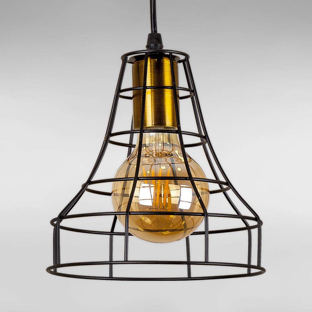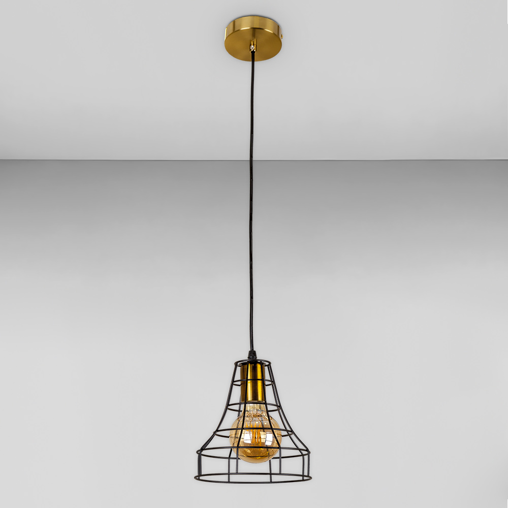 Підвісна люстра на одну лампу в сучасному стилі з плафоном конусної форми, у вигляді металевої клітки.