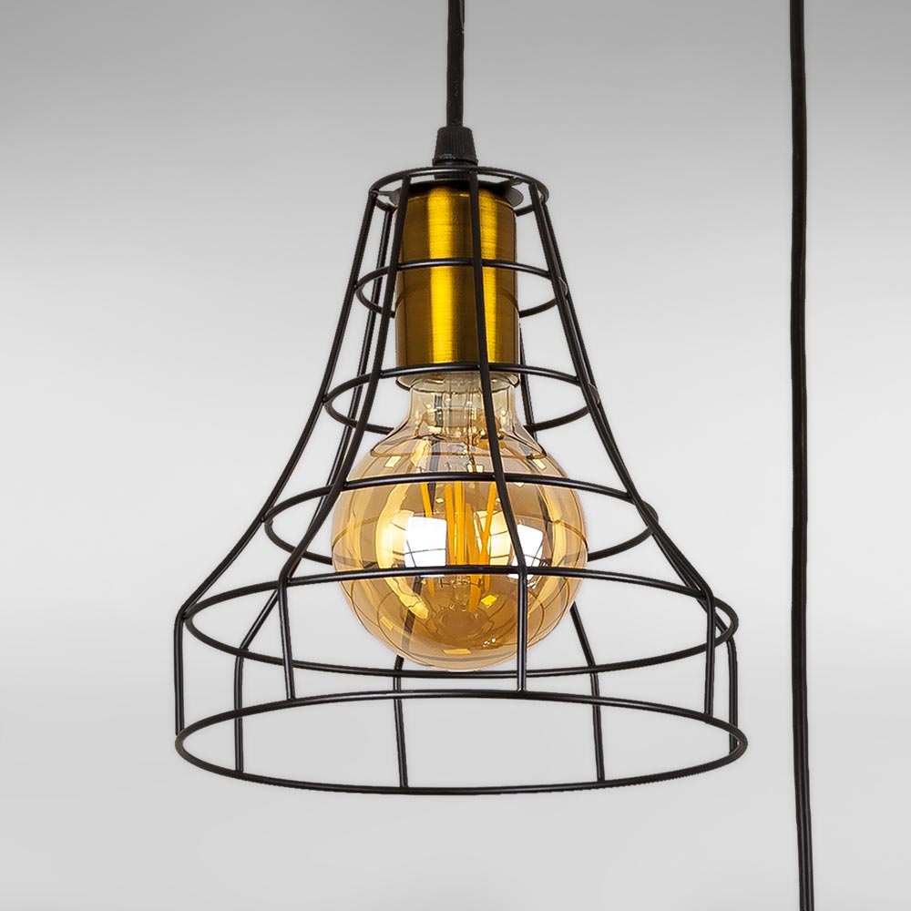 Підвісна люстра на три лампи в сучасному стилі з плафонами конусної форми у вигляді металевої клітки.
