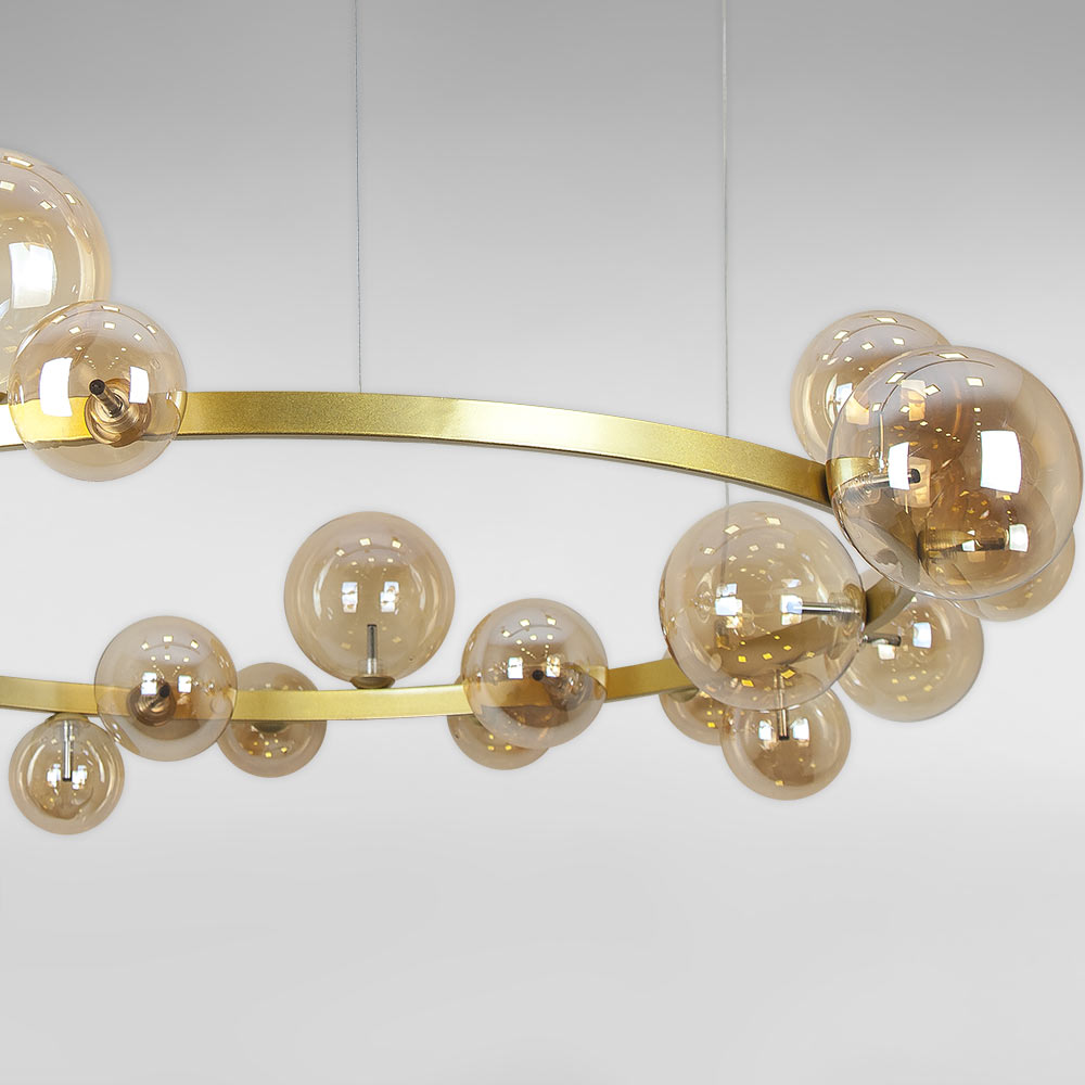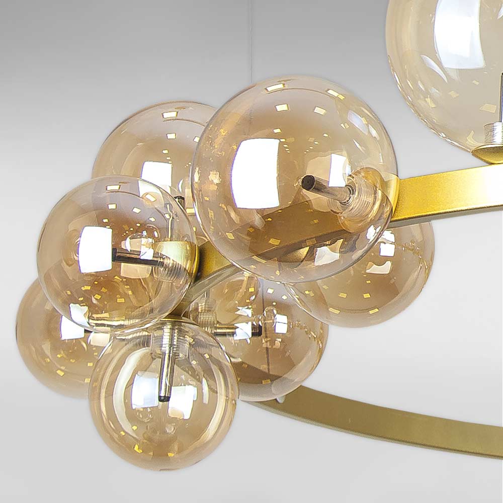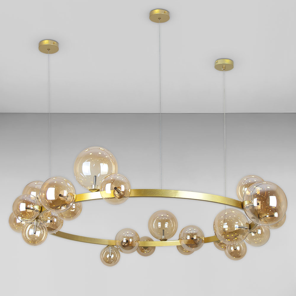 Сучасна підвісна люстра в стилі Лофт на 24 лампи зі скляними плафонами-кулями різного діаметру на корпусі у вигляді кільця.