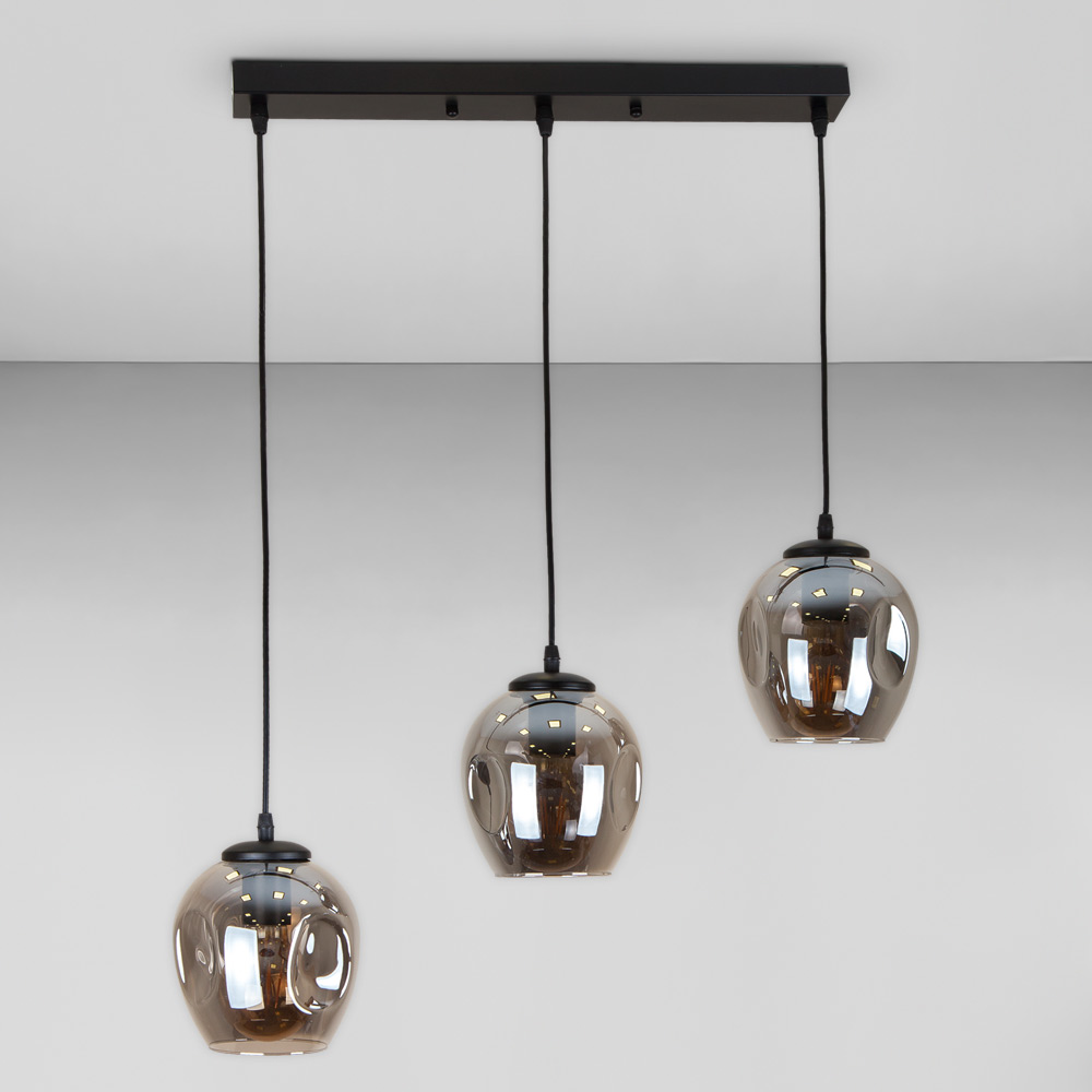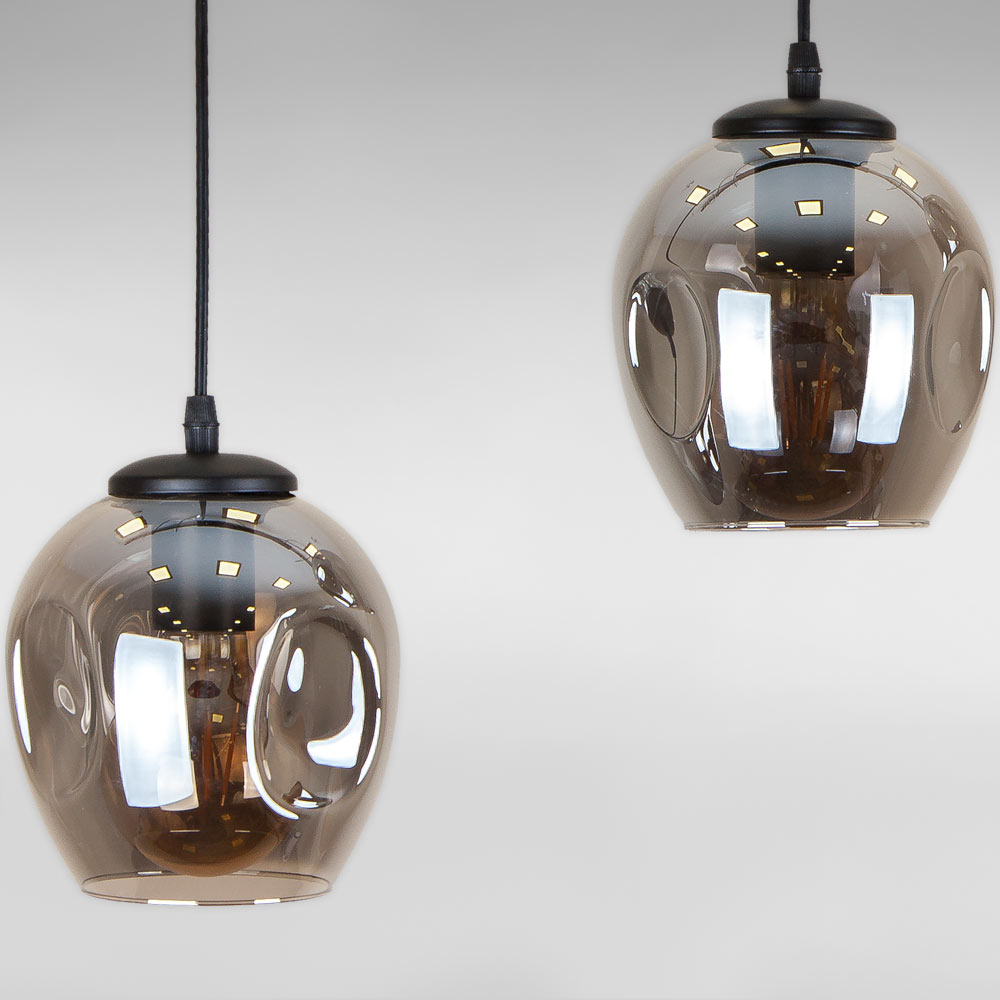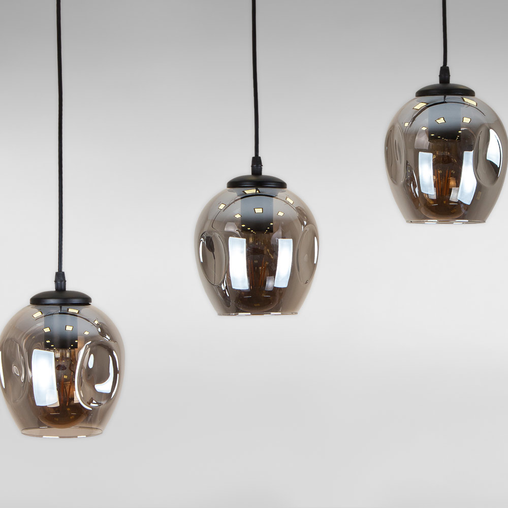 Сучасна підвісна люстра в стилі лофт на три лампи зі скляними фігурними плафонами овальної форми.