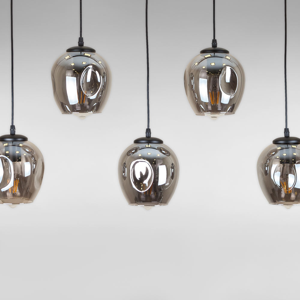 Сучасна підвісна люстра в стилі лофт на п'ять ламп зі скляними фігурними плафонами овальної форми.