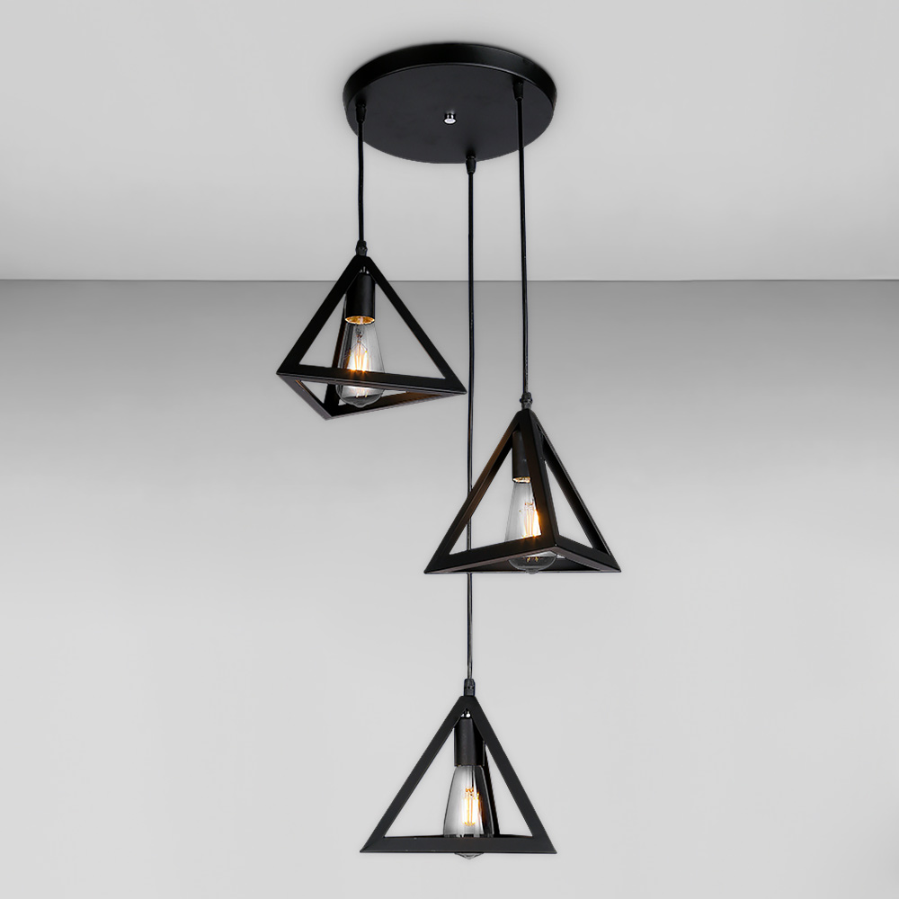 Підвісна люстра на три лампи в сучасному стилі з металевими плафонами у вигляді ребер піраміди.