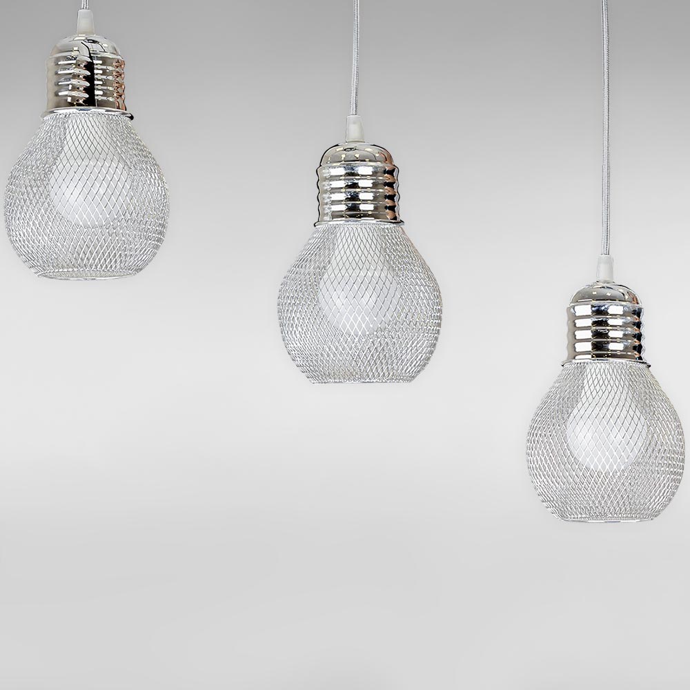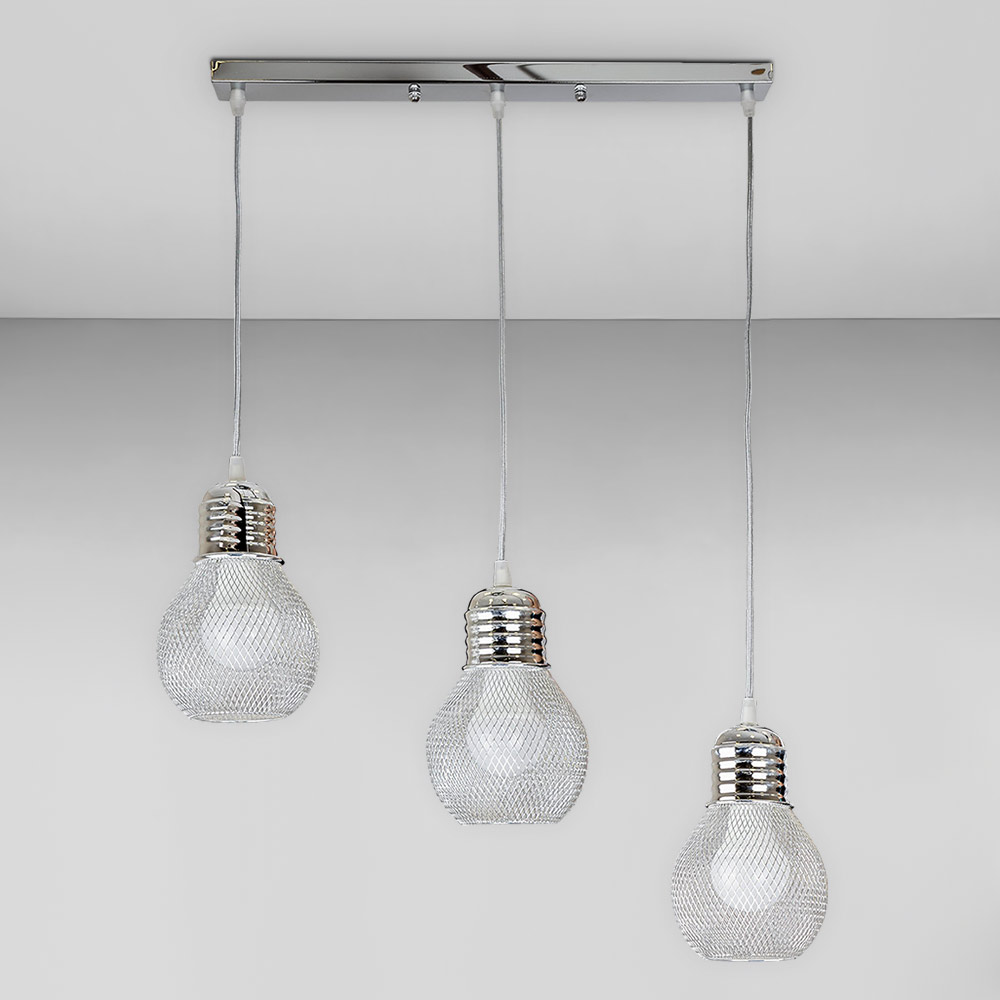 Підвісна люстра на три лампи у сучасному стилі з металевими круглими плафонами у вигляді сітки.