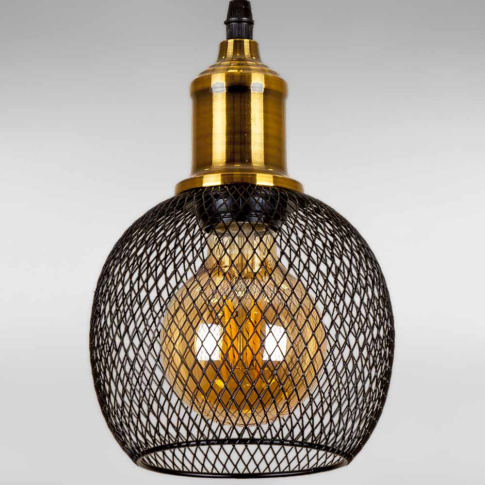 Сучасна підвісна люстра в стилі лофт на одну лампу з плафоном у вигляді металевої сітки круглої форми.