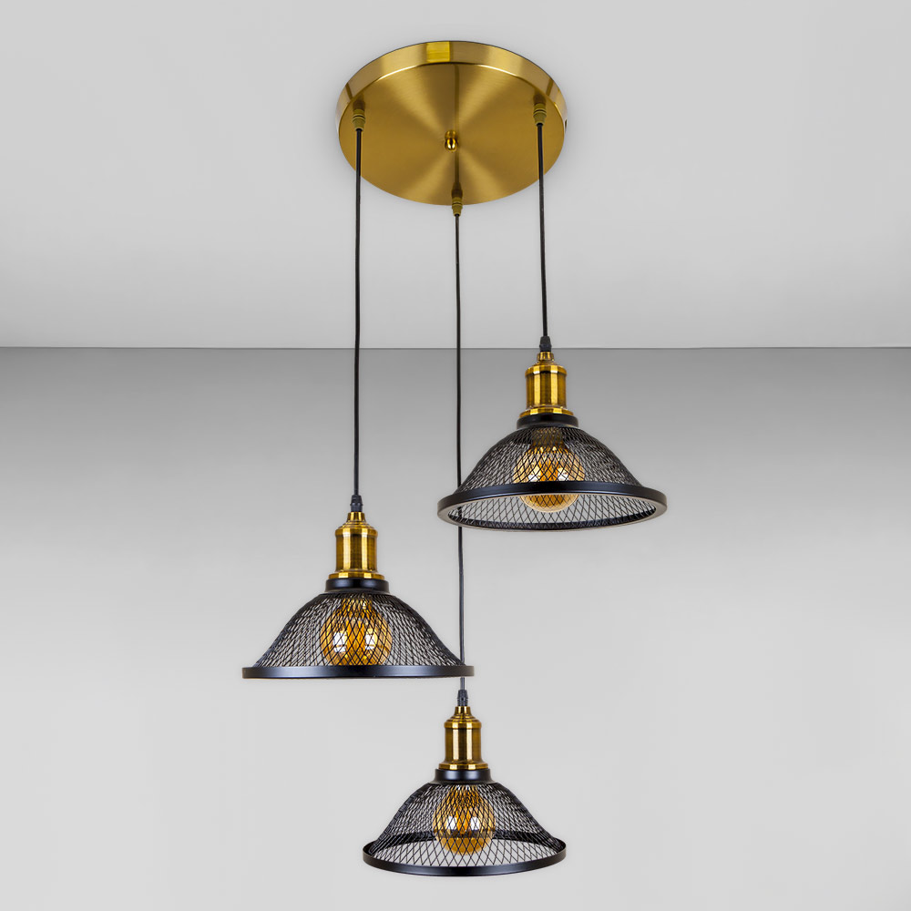 Сучасна підвісна люстра в стилі лофт на три лампи з плафонами форми купола у вигляді металевої сітки.