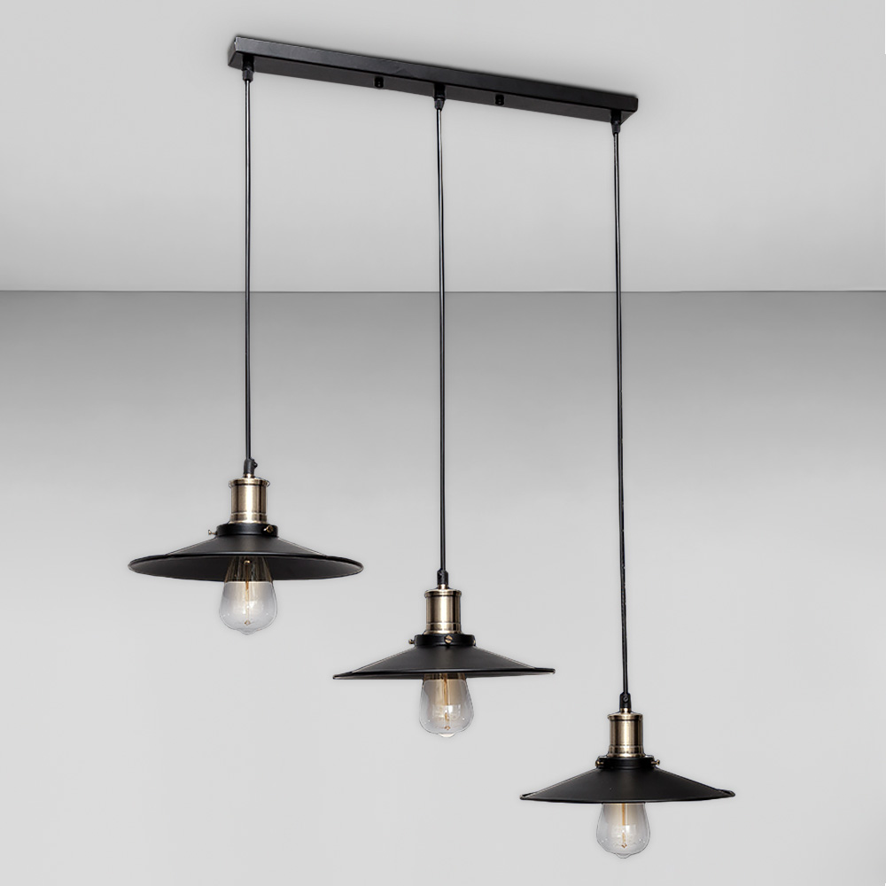 Сучасна підвісна люстра в стилі лофт на три лампи з металевими, плоскими, круглими плафонами (тарілка).