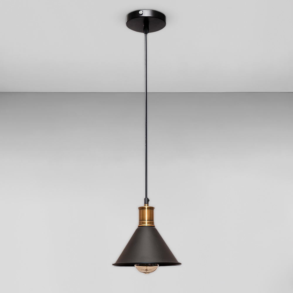 Сучасна підвісна люстра в стилі лофт на одну лампу з металевим плафоном конусної форми.