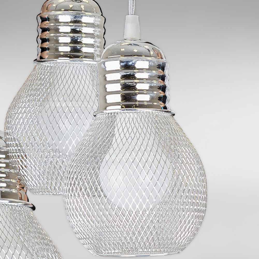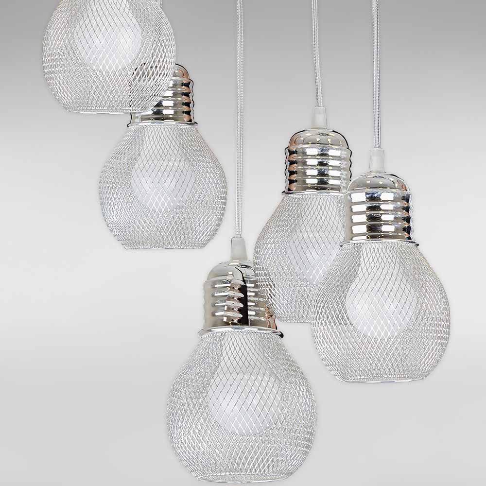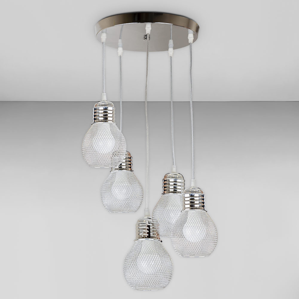 Підвісна люстра на п'ять ламп у сучасному стилі з металевими круглими плафонами у вигляді сітки.