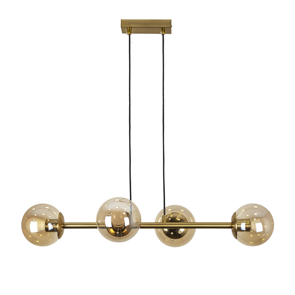 Сучасна підвісна люстра-молекула на чотири лампи зі скляними плафонами.
