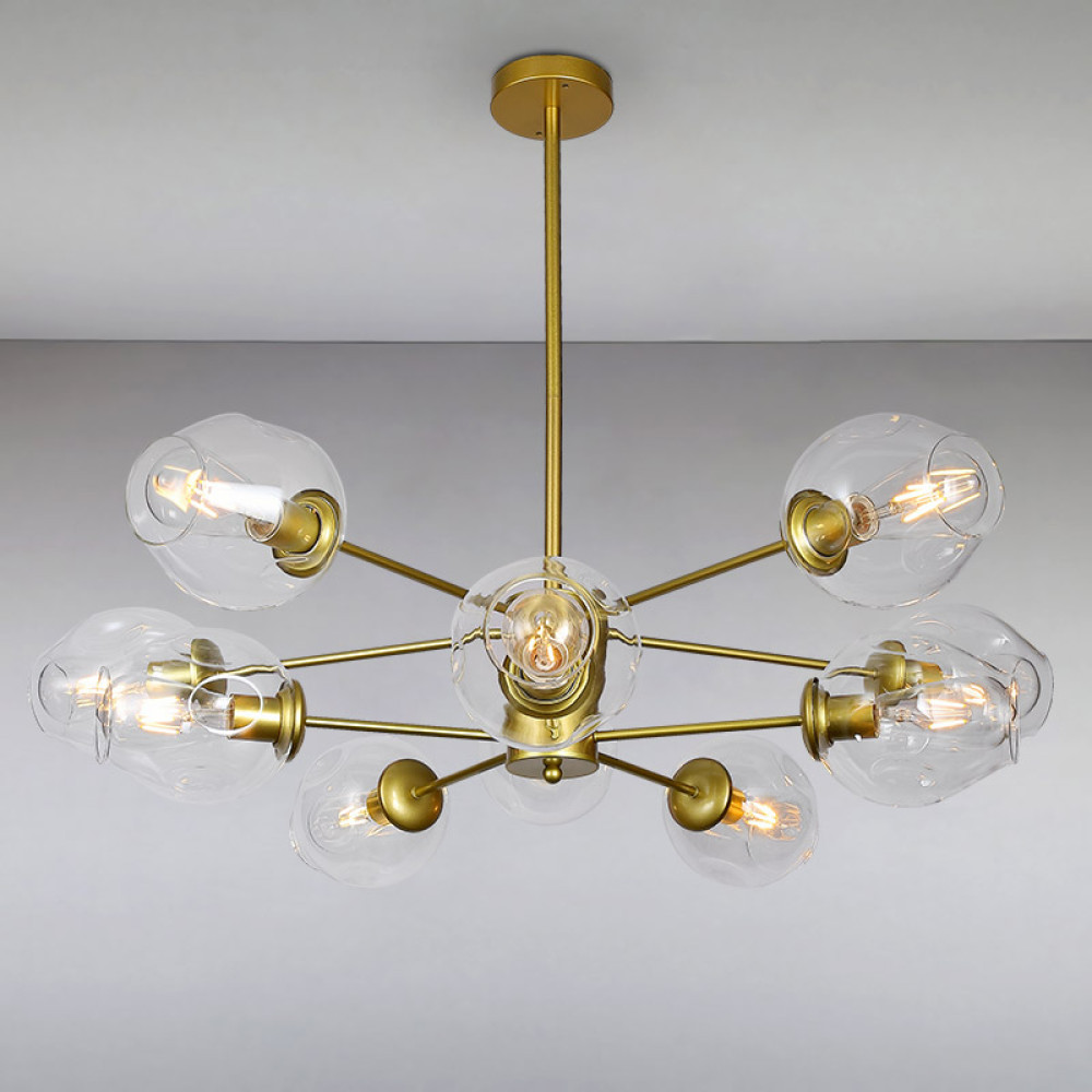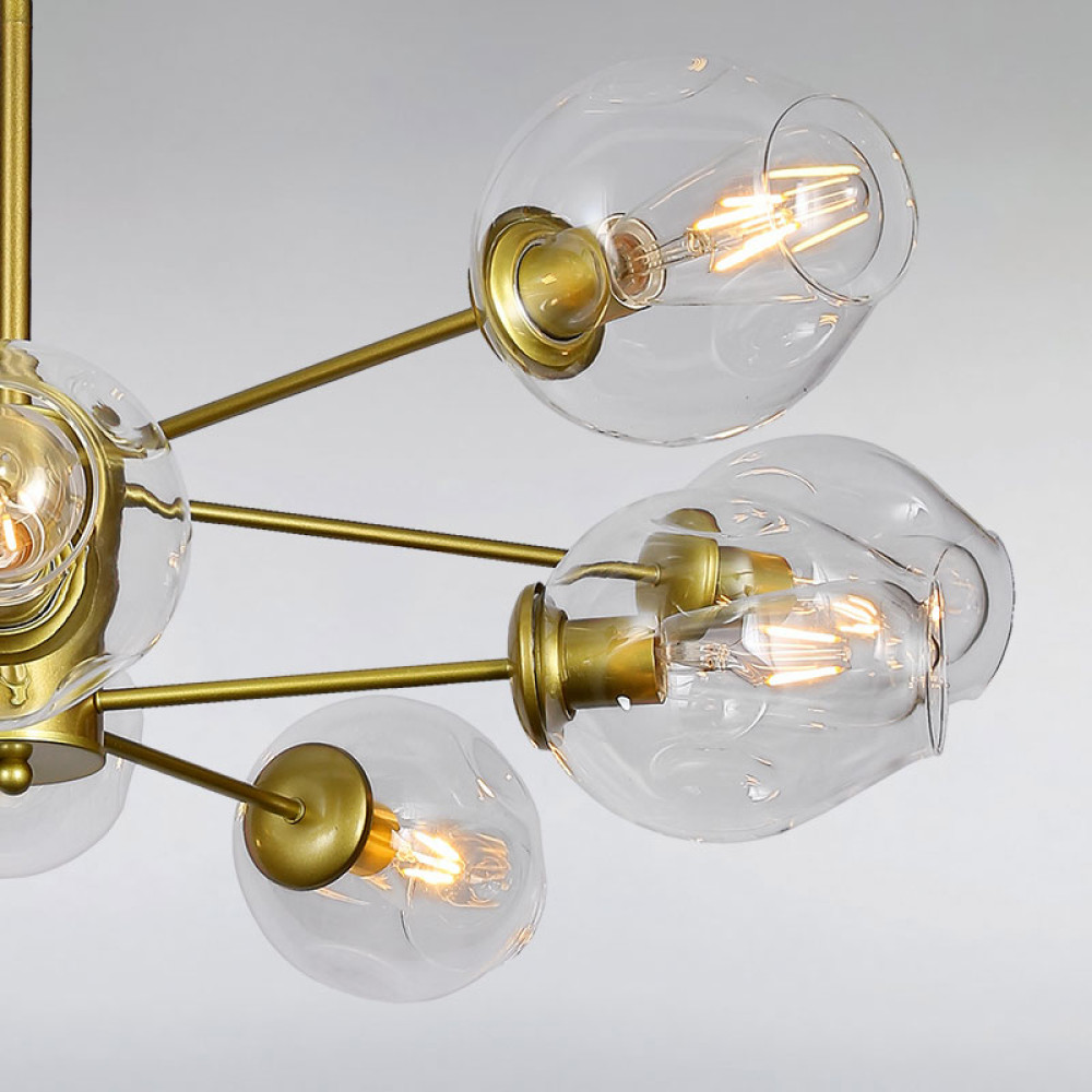 Люстра на десять ламп із металу золотого кольору і скляних прозорих плафонів.