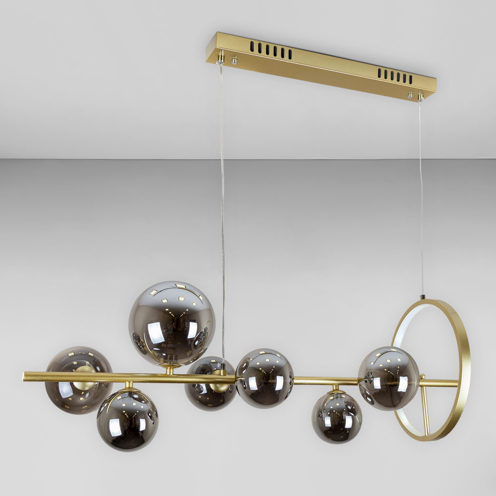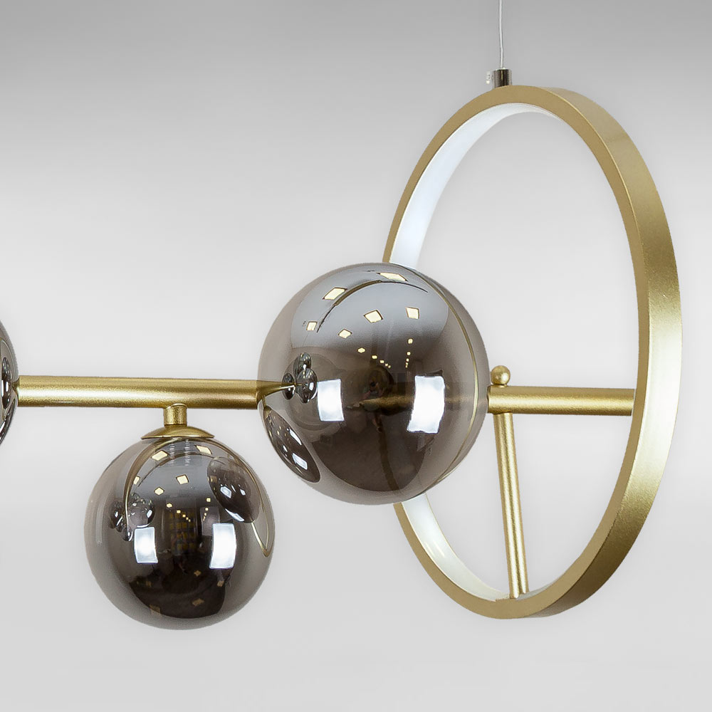 Підвісна декоративна люстра молекули на сім ламп G9 зі скляними плафонами куль і LED кільце.