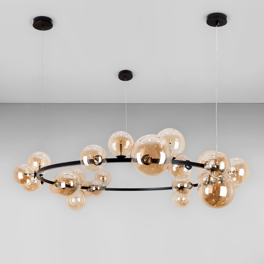 Підвісна декоративна люстра молекули на 24 лампи G4 зі скляними плафонами кулями на корпусі у вигляді кільця.