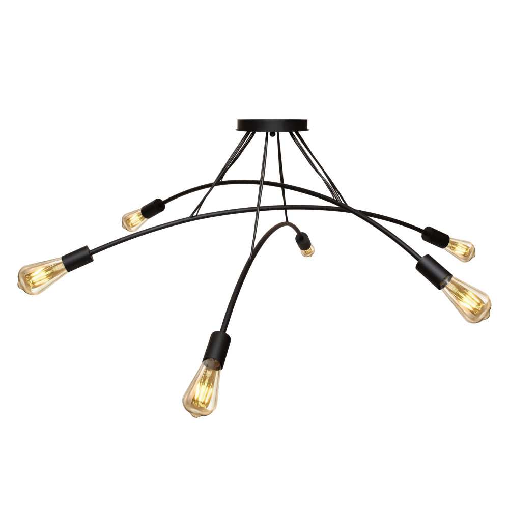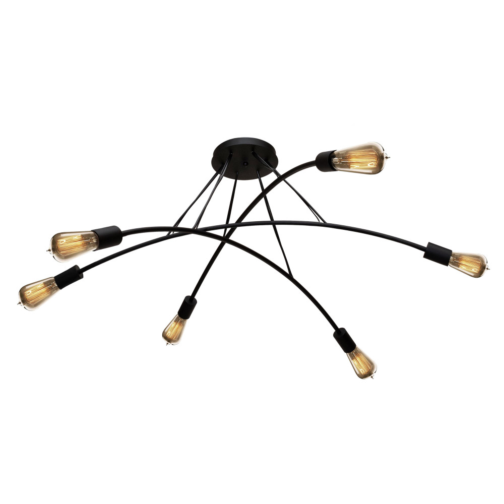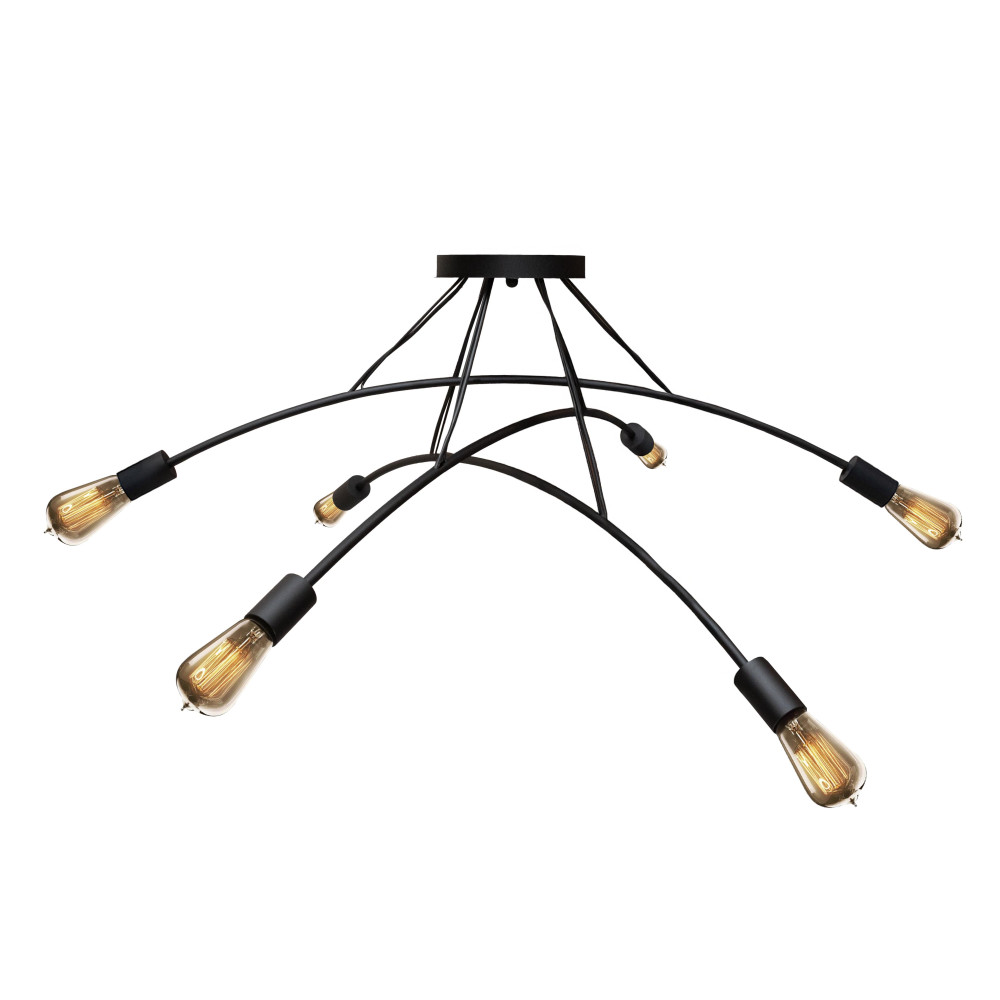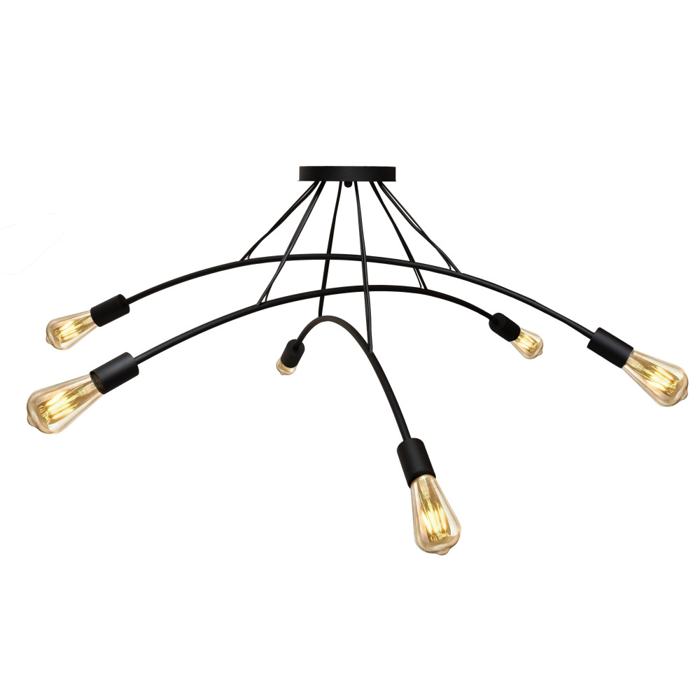 Ця модель поєднує лаконічний дизайн та індустріальну естетику, створюючи атмосферу затишку та сучасного комфорту. Чорний металевий каркас із витонченими вигнутими дугами робить люстру візуально легкою, а відкриті лампи E27 посилюють відчуття простору та наповнюють приміщення м'яким, теплим світлом.