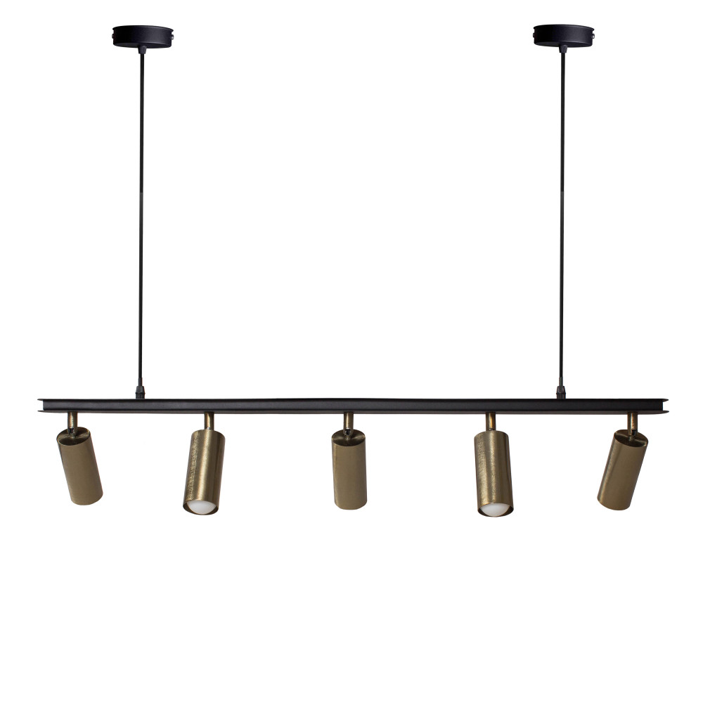 Підвісна люстра в стилі лофт на п'ять плафонів з металу на довгу планку. Плафони циліндричної форми із поворотним механізмом під лампу Е27.