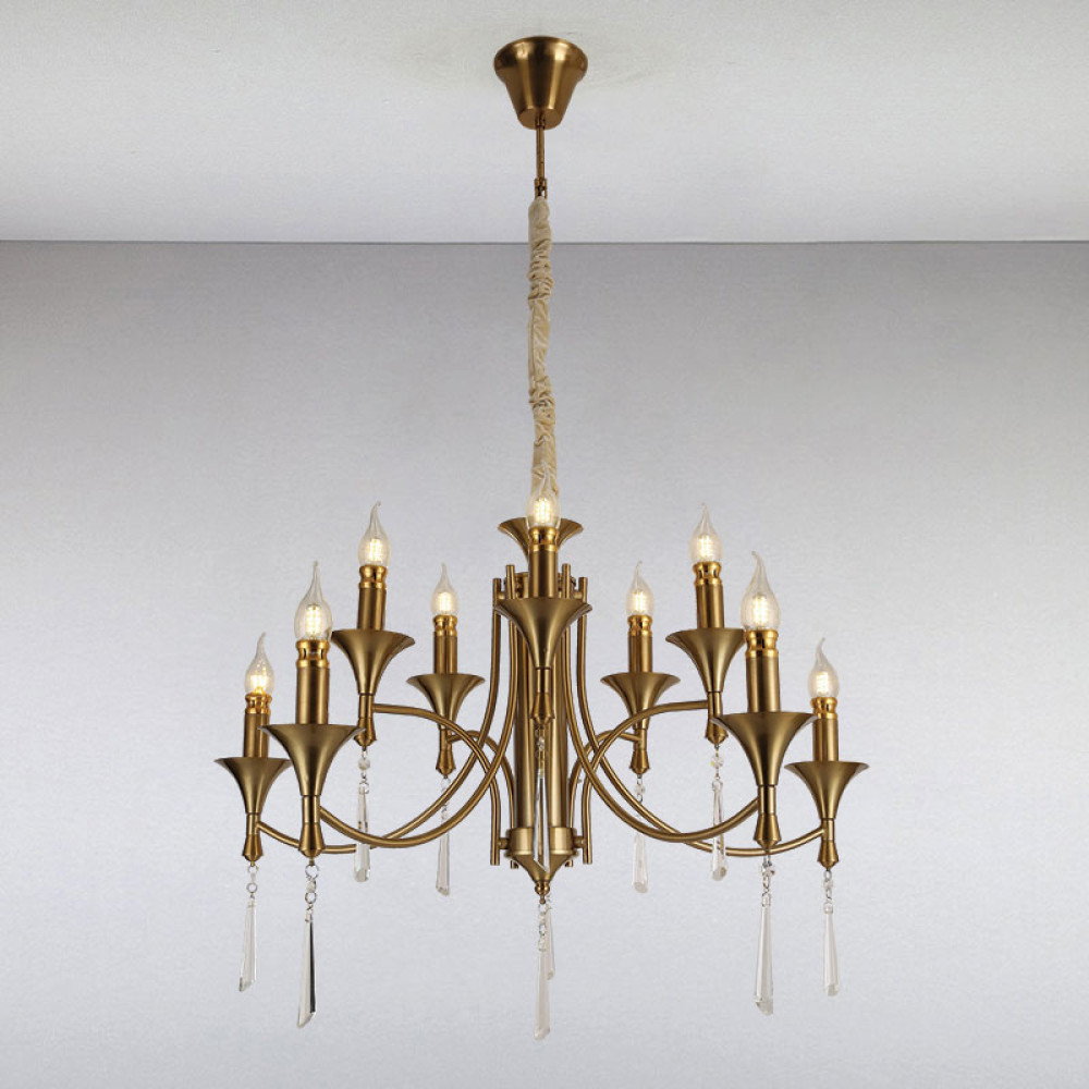 Люстра свічки на десять джерел світла. Виконана в класичному стилі, має підвісні елементи з кришталю.