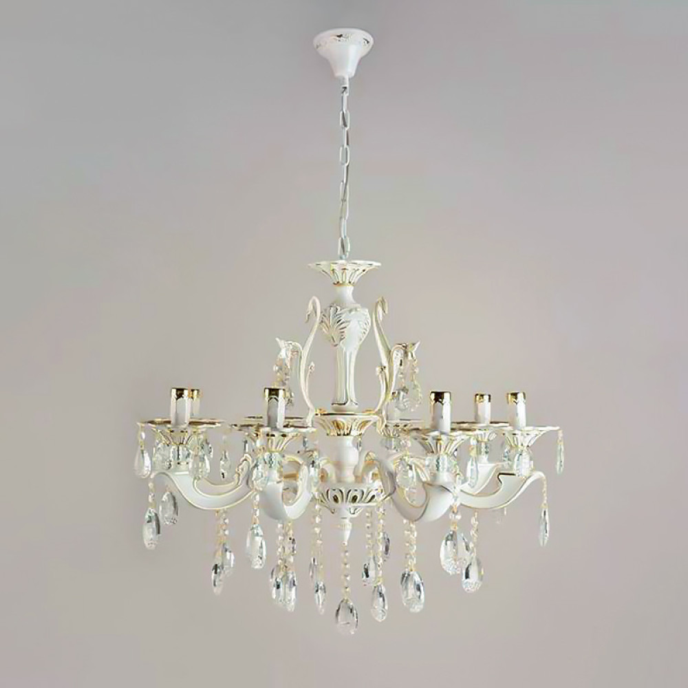 Підвісна люстра в класичному стилі на вісім ламп у вигляді свічника з кришталевими підвісками.