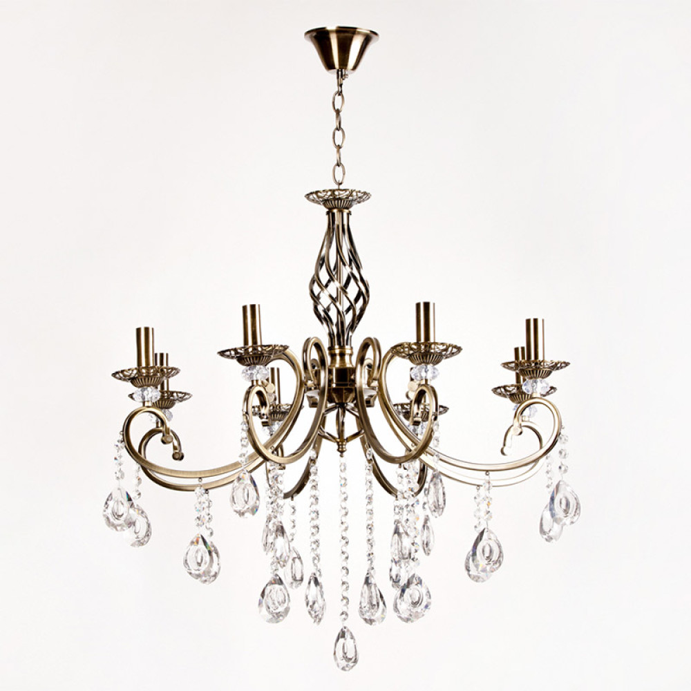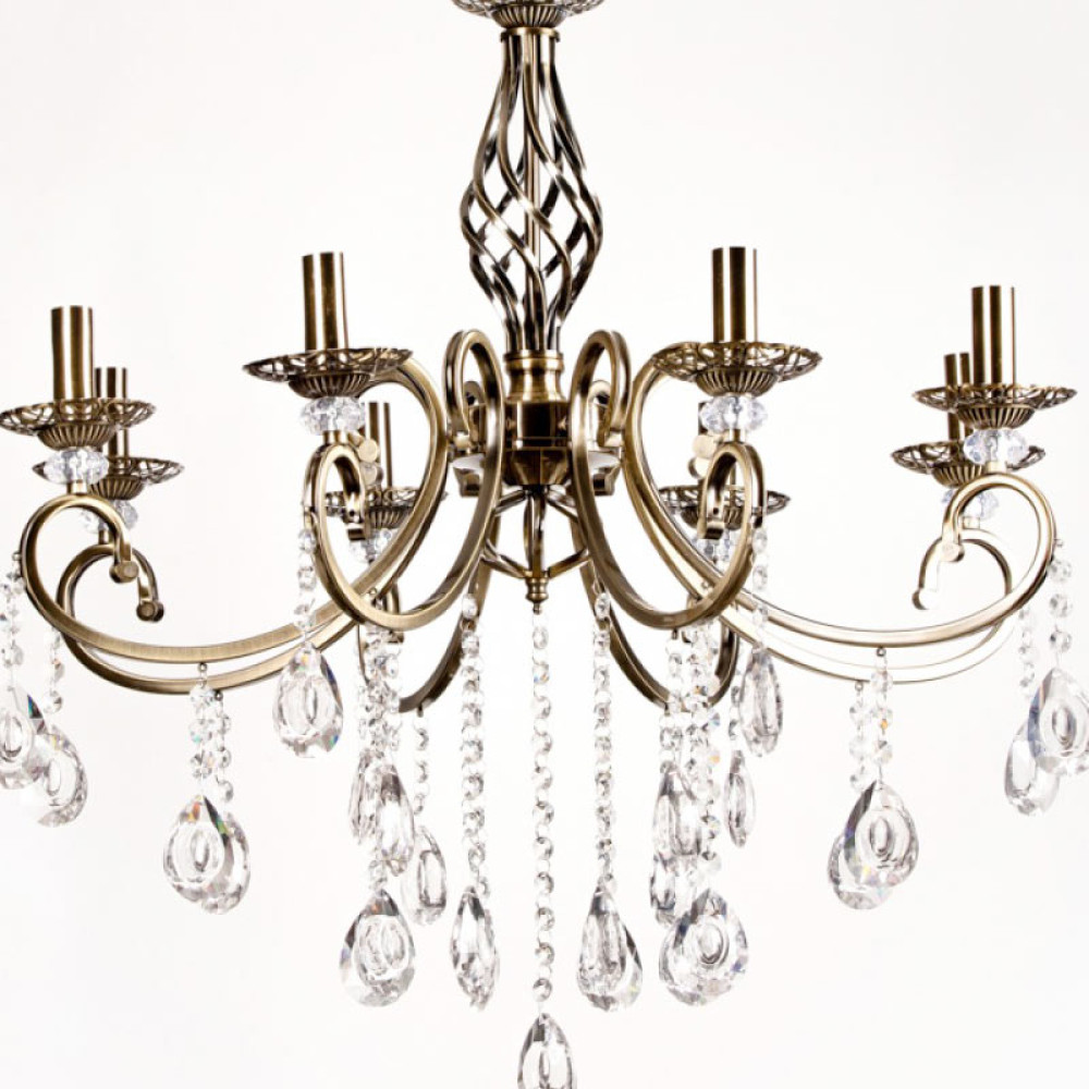 Підвісна класична люстра на вісім ламп у вигляді підсвічників з кришталевими підвісками. Вона буде королевою вашої кімнати.