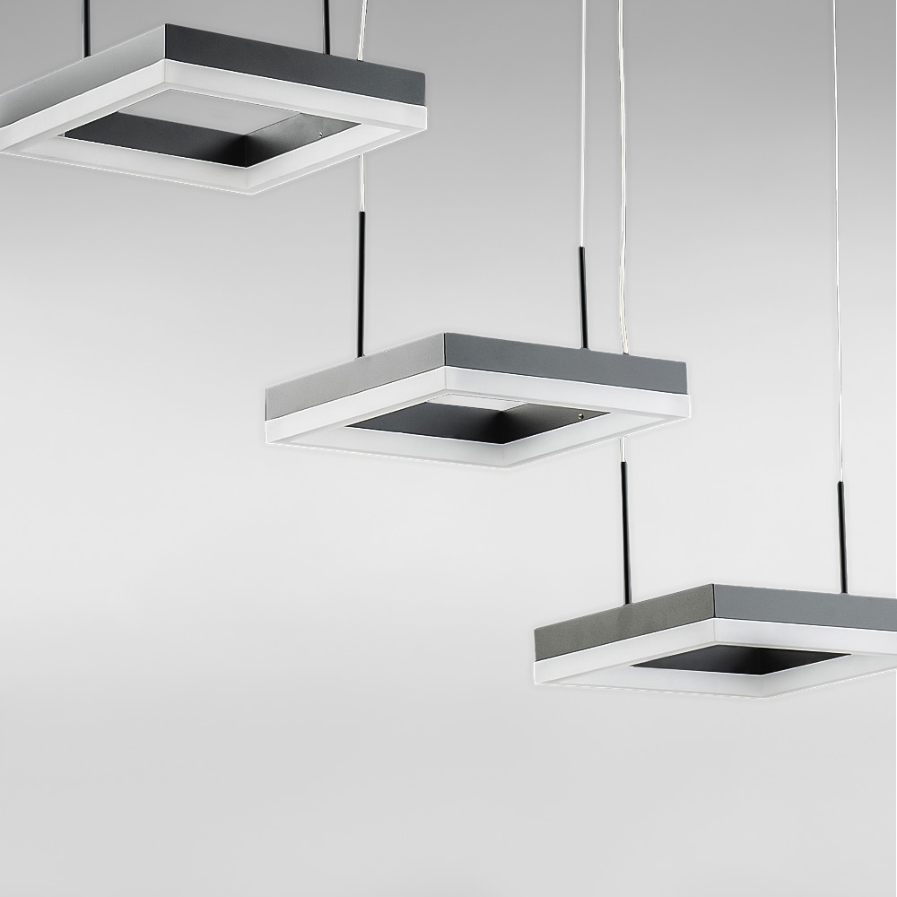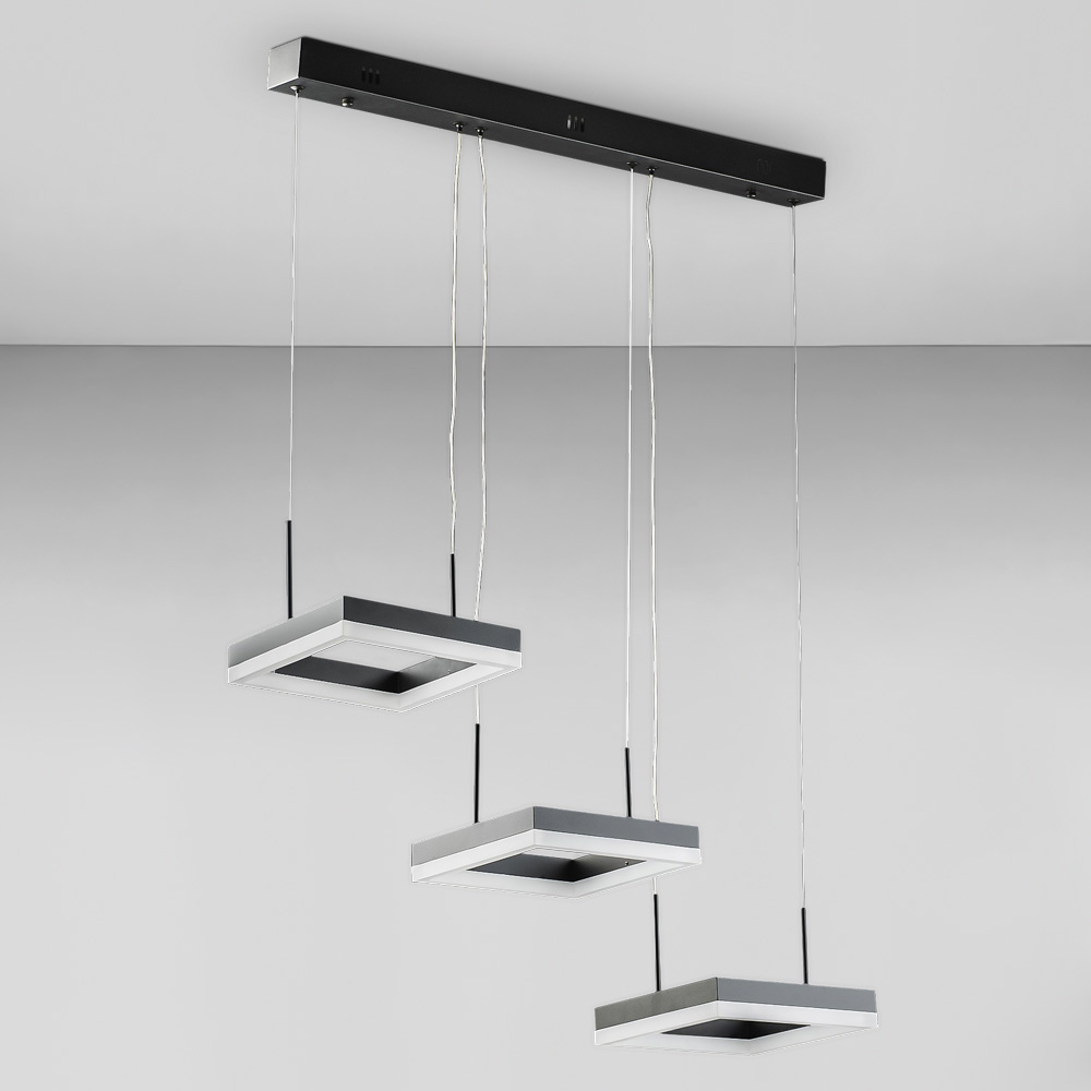 Підвісна декоративна світлодіодна люстра в сучасному стилі на три джерела світла у вигляді плоских LED квадратів, без пульта управління.