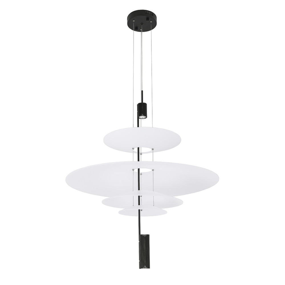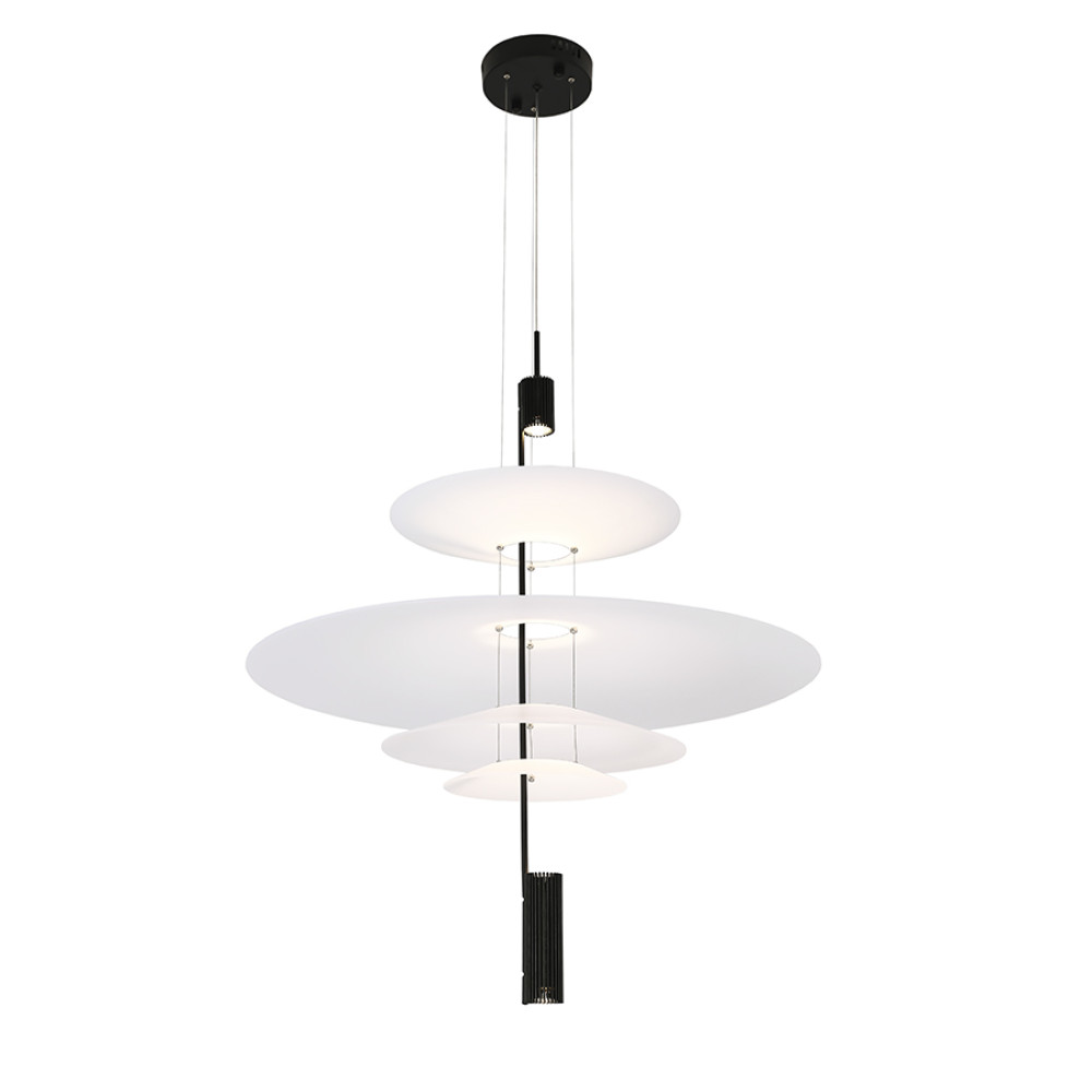 Сучасна декоративна підвісна LED люстра з нейтральною температурою кольору 4000K, без пульта управління. Незвичайний дизайн люстри представлений у вигляді конструкції з чотирьох акрилових плафонів на одній осі, які мають форму тарілки, різних розмірів. Білі матові плафони м'яко розсіюють світло та створюють приємний затишний ефект.
