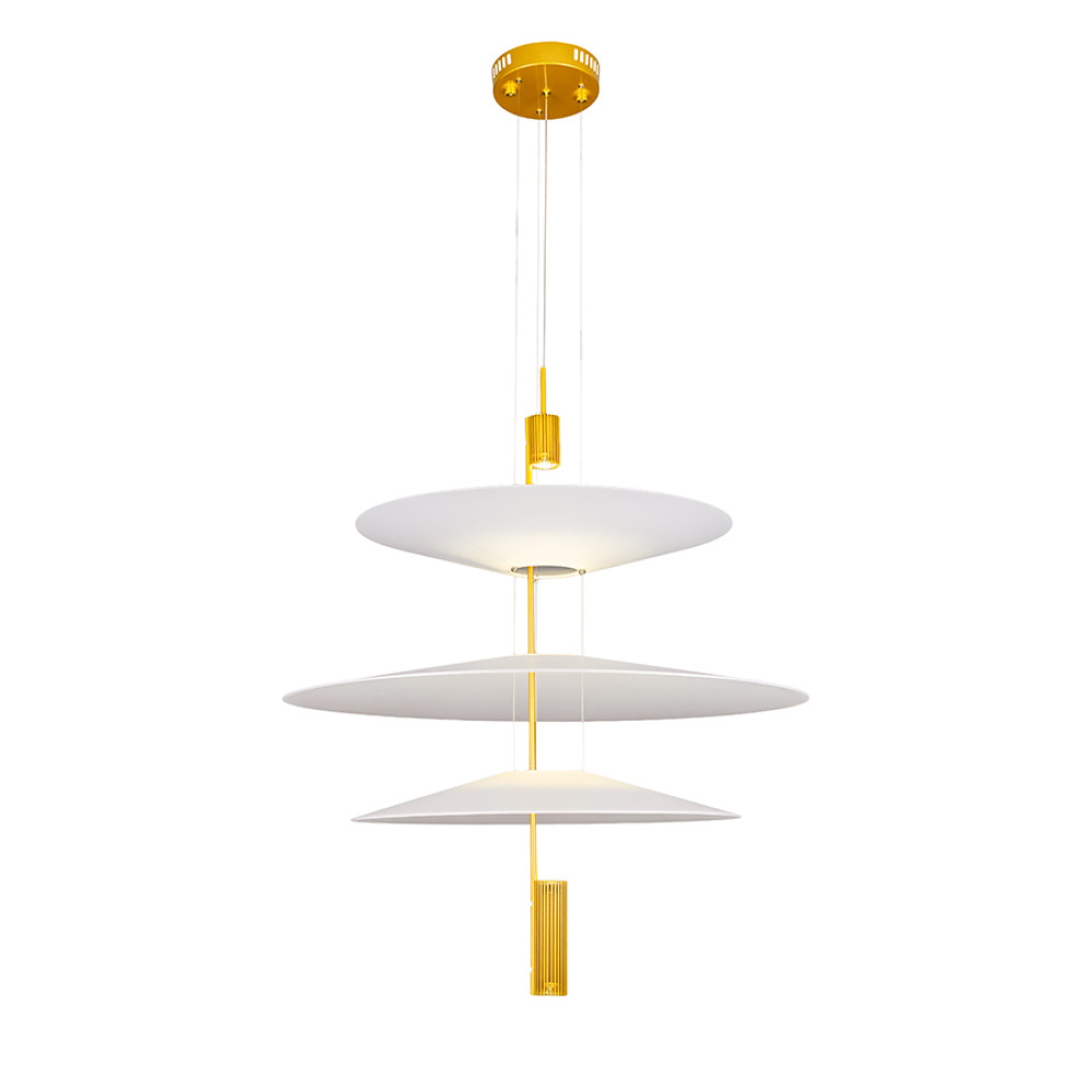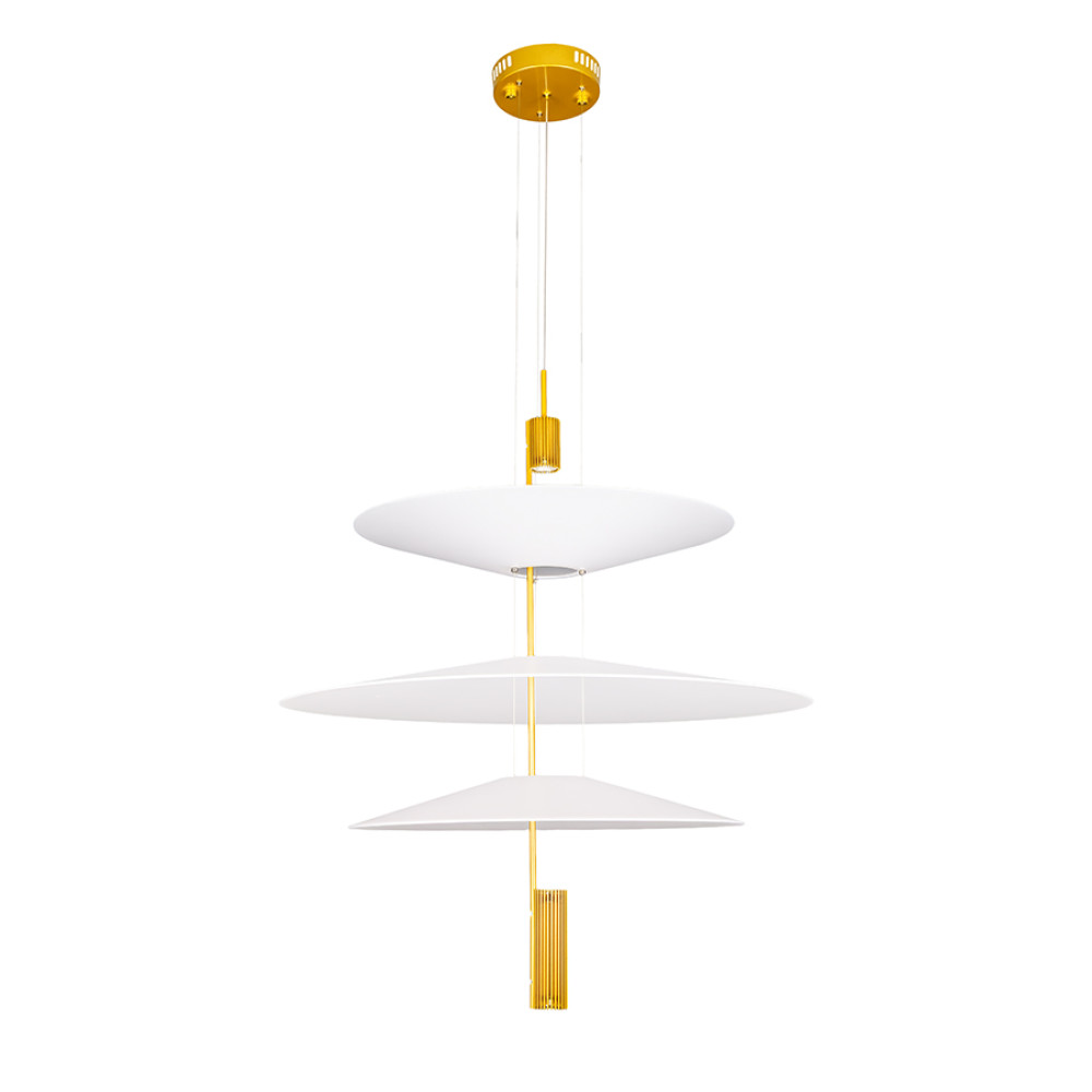 Сучасна декоративна підвісна LED люстра з нейтральною температурою кольору 4000K, без пульта управління. Незвичайний дизайн люстри представлений у вигляді конструкції із трьох пластикових плафонів на одній осі, які мають форму тарілки, різних розмірів. Білі матові плафони м'яко розсіюють світло та створюють приємний затишний ефект.