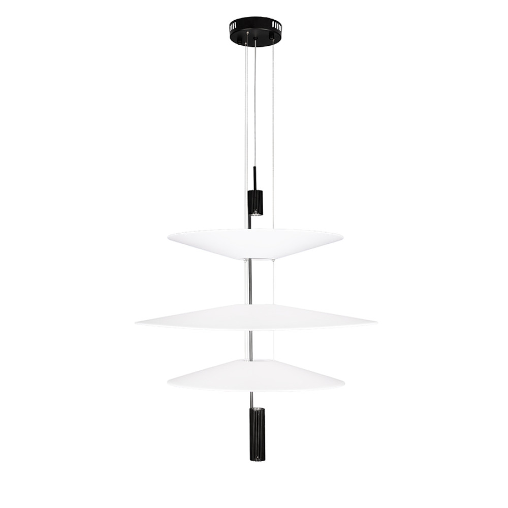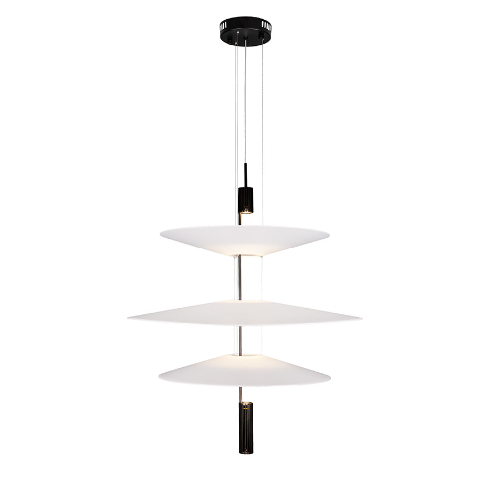 Сучасна декоративна підвісна LED люстра з нейтральною температурою кольору 4000K, без пульта управління. Незвичайний дизайн люстри представлений у вигляді конструкції із трьох пластикових плафонів на одній осі, які мають форму тарілки, різних розмірів. Білі матові плафони м'яко розсіюють світло та створюють приємний затишний ефект.